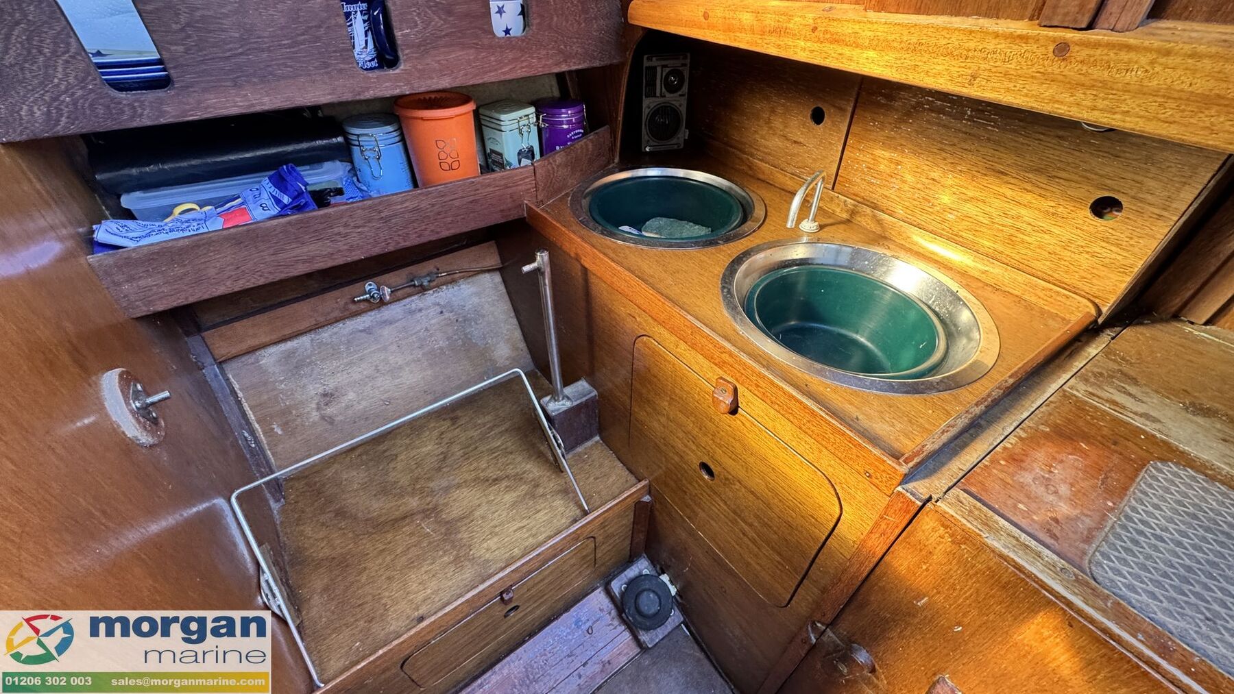Cabin: Main forward V-shaped cabin with 2 berths. Saloon starboard and port side cushioned seating with fold up table - Can be used for another 2x single berths. Galley with 2x sinks and lots of storage. - Space for gas burner. Forward toilet compartment with sea toilet and storage. Chart table. Engine lid compartment from lift up steps.