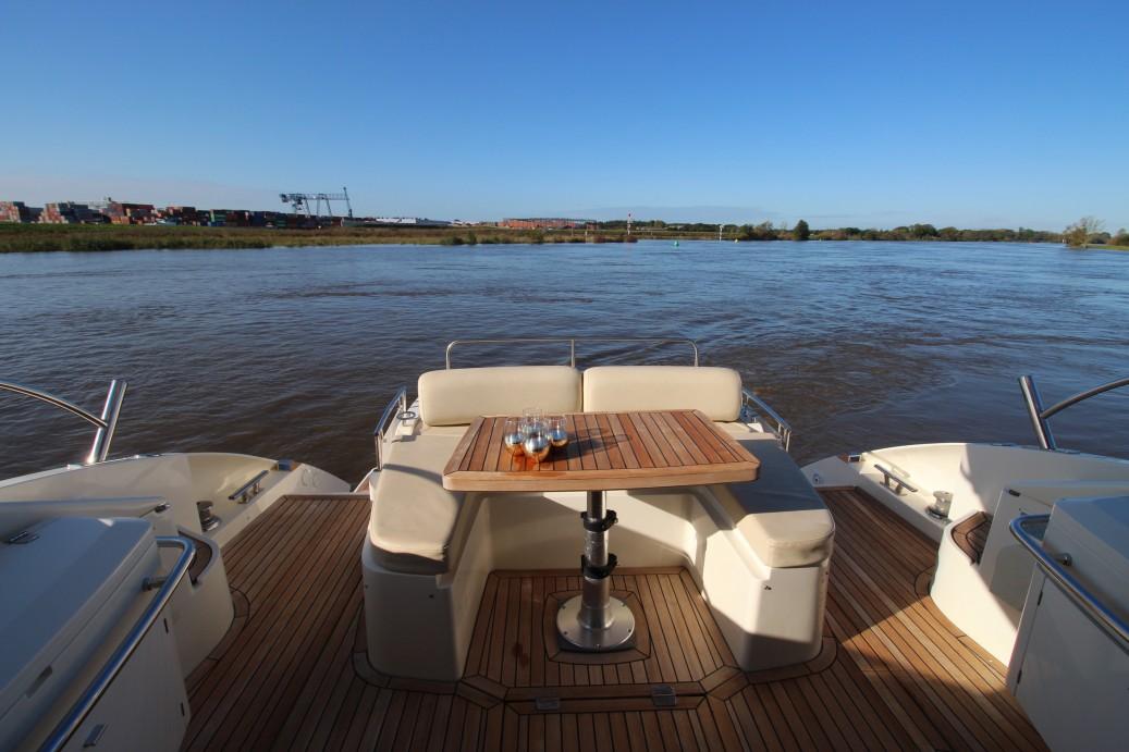 On deck, the layout remains practical and luxurious, featuring a large sunbathing area at the bow, a comfortable aft lounge, and a retractable hardtop sunroof for flexibility in varying weather conditions. The hydraulic swim platform, a signature feature of the Atlantis range, facilitates easy access to the water for swimming and watersports.