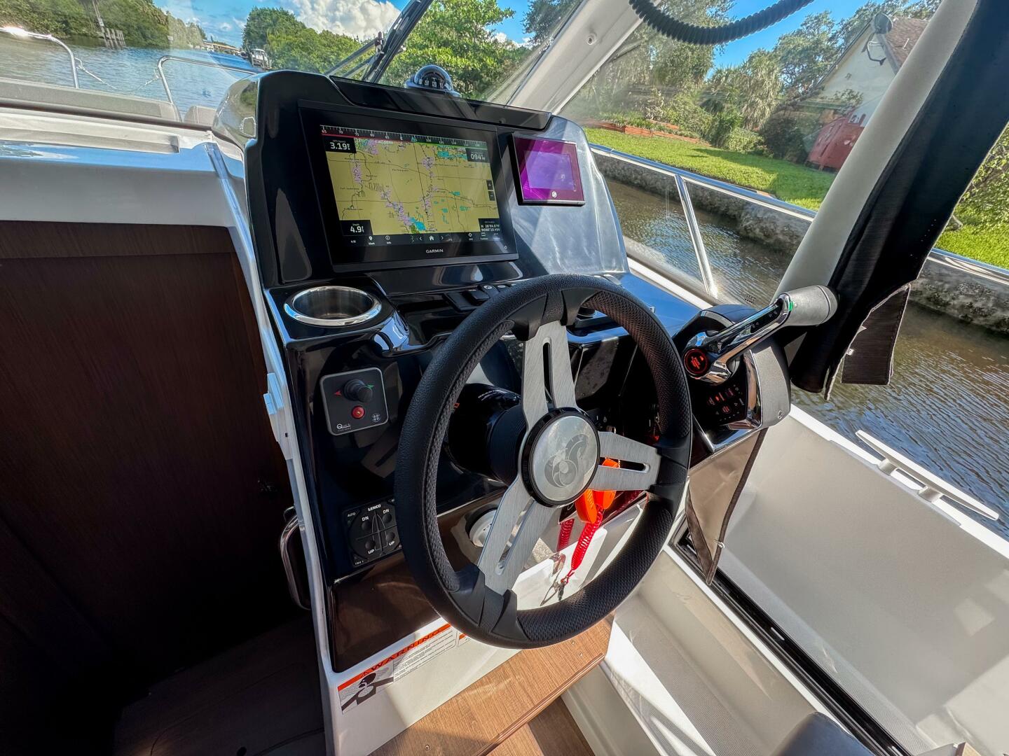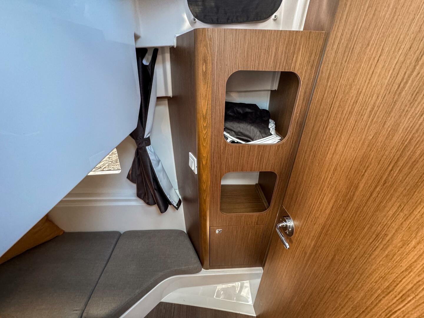 The cockpit and saloon are made for socializing, with the Cockpit Saloon in Elegance upholstery and front sunlounge mattresses maximizing outdoor comfort. Premium electronics, Garmin VHF radio, Electronic Upgrade Package, and Trim Level Comfort Package, ensure ease of navigation.