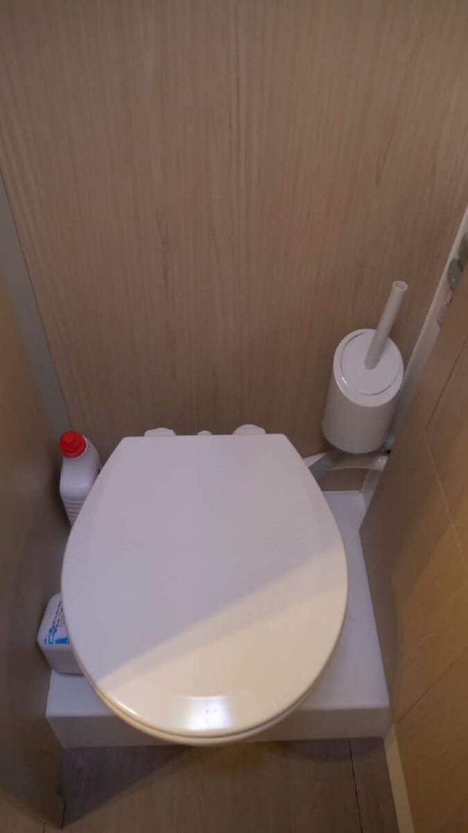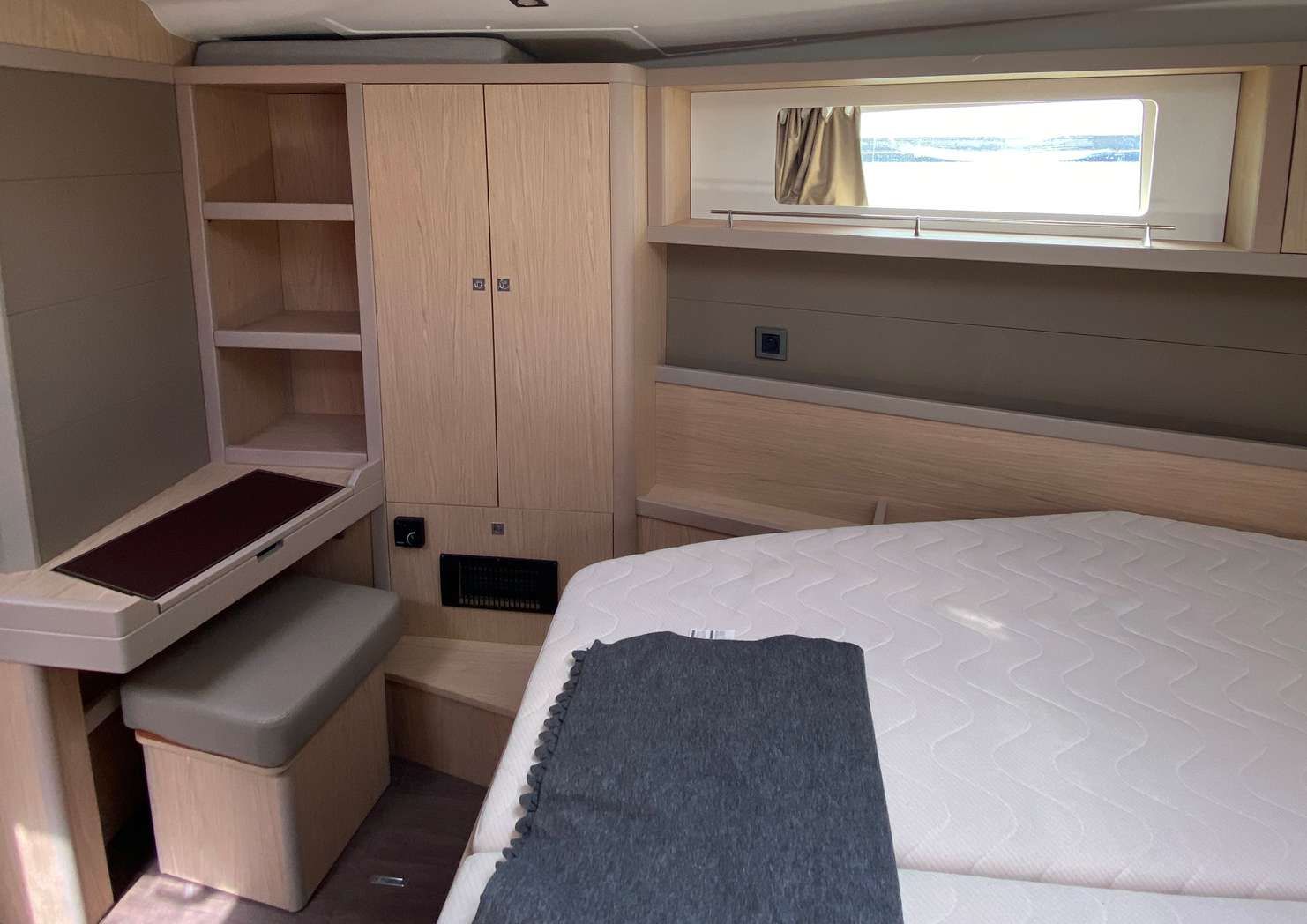 Cabine propriétaire avant : lit double central, dressing, coiffeuse avec assise, salle d’eau privative avec douche séparée et WC électrique