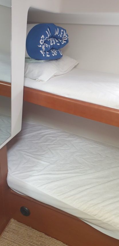 Sommiers à lattes (cabine avant + cabine tribord – couchette basse)