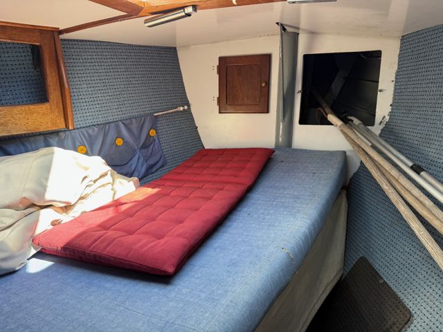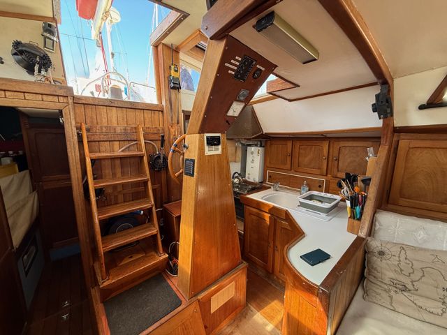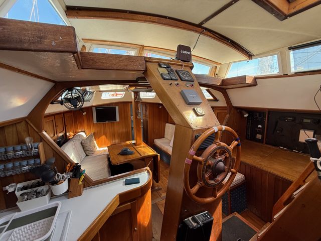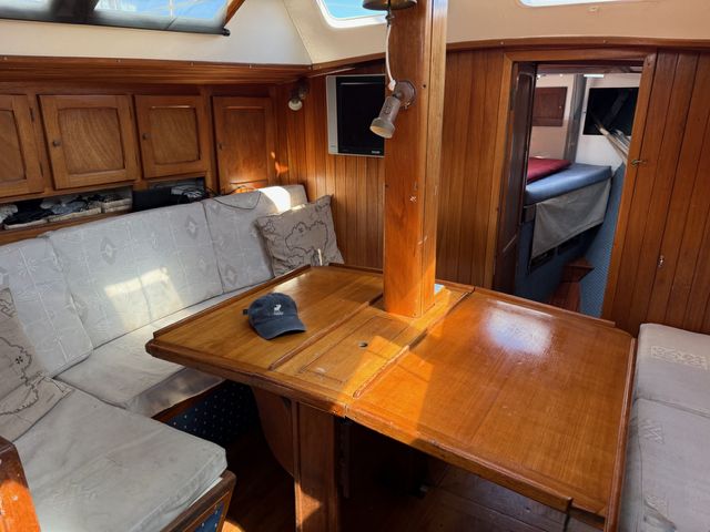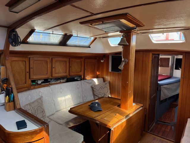 El interior es luminoso y amplio, con una timonería interior que ofrece visibilidad panorámica y una rueda interior conectada mecánicamente con la rueda exterior. El salón cuenta con una gran mesa modular rodeada de múltiples espacios de almacenamiento. La cocina está equipada con cocina ENO, calentador de agua a gas, frigorífico y tres depósitos de agua con un total de 320 litros. La cabina de popa ofrece una amplia cama doble y muchos armarios, mientras que la cabina de estribor dispone de dos literas convertibles. En proa, un baño con bañera y ducha de agua caliente da acceso a la cabina delantera con una cama semi-doble y un enorme cofre para velas y equipos.