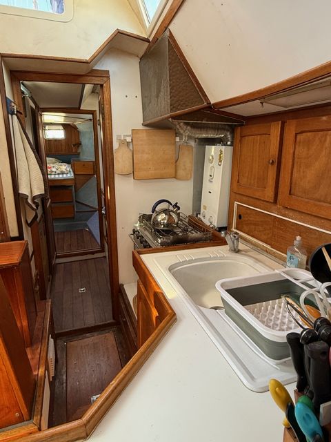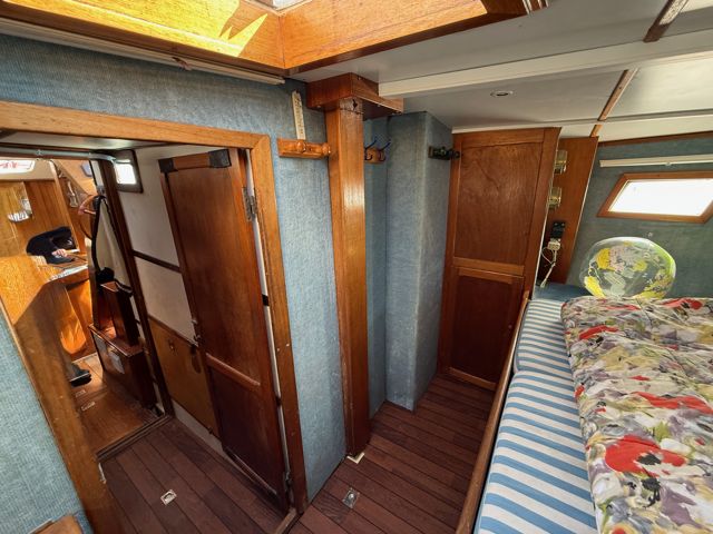 The interior is bright and spacious, featuring an inside wheelhouse offering panoramic visibility and an interior helm mechanically linked to the outside steering. The saloon includes a large convertible table surrounded by generous storage. The galley is equipped with an ENO stove, gas water heater, refrigerator, and three freshwater tanks totalling 320 litres. The aft cabin offers a large double berth and significant storage, while the starboard cabin provides two convertible bunks. Forward, a bathroom with a bath/shower and hot/cold water leads to the forward cabin with a semi-double berth and a very large sail locker.