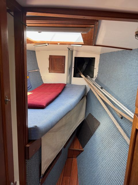 The rig includes a 15-metre Francespar mast, ACMO stainless-steel standing rigging, a full-batten mainsail in good condition, a 50 m² genoa also in excellent shape, a near-new staysail, and a storm jib that has never been used. All chainplates are stainless steel, and the entire rig is sized for demanding offshore sailing.