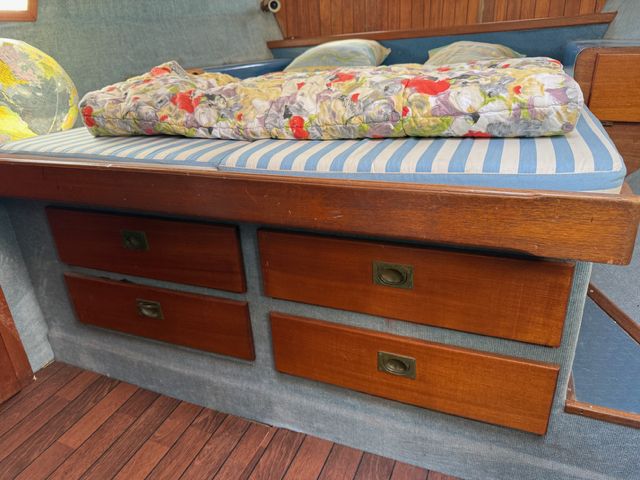 L’intérieur, lumineux et spacieux, dispose d’une timonerie intérieure offrant une vue panoramique ainsi qu’une barre intérieure couplée à la barre extérieure. Le carré accueille une grande table modulable entourée de nombreux rangements. La cuisine est équipée d’un four ENO, d’un chauffe-eau gaz, d’un réfrigérateur et de trois réservoirs d’eau pour un total de 320 litres. La cabine arrière propose une grande couchette double et de nombreux rangements, tandis que la cabine tribord dispose de deux couchettes superposées modulables. À l’avant, la salle d’eau comprend une baignoire sabot avec eau chaude et froide, suivie d’une cabine avant dotée d’une couchette semi-double et d’un vaste rangement pour les voiles et équipements.