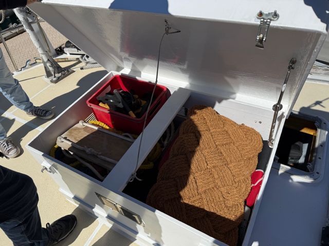La cubierta de proa es amplia y despejada e incorpora un molinete Lofran Tigre de 1000 W, un ancla Delta de 35 kg con unión de acero inoxidable y un ancla Brittany de 23 kg como repuesto. El cockpit central es protegido y funcional, equipado con ocho winches Lewmar, una brújula Silva montada en columna Morse, una capota anti-UV con una segunda capota completamente nueva, y un lazy-bag prácticamente nuevo. En popa, los pescantes sostienen los paneles solares Siemens instalados en 2024 y una plataforma de baño en acero inoxidable facilita el acceso al mar. Toda la cubierta dispone de un antideslizante Kiwi Grip reciente.