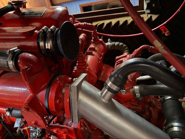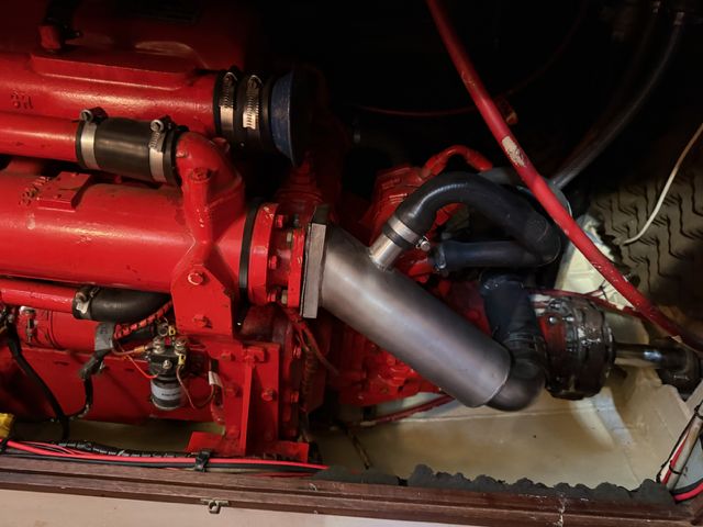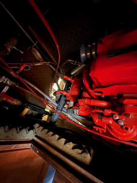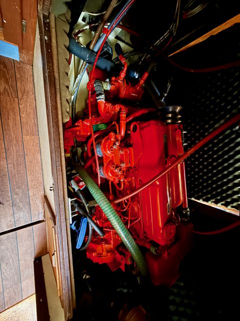 El motor es un Fornaut diésel de 83 CV con unas 3.200 horas, alimentado por un depósito principal de 600 litros integrado en la quilla y un depósito diario de 70 litros. El acceso al motor es excelente desde las cabinas laterales. El circuito de gasoil dispone de pre-filtro y doble filtración, la bomba de agua dulce fue sustituida en 2023 y la hélice tripala Vetus está totalmente protegida por el timón apoyado sobre el codaste.