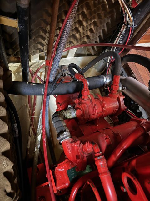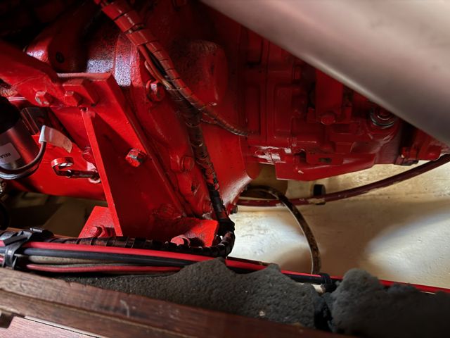 La motorisation repose sur un diesel Fornaut 83 CV totalisant environ 3 200 heures. Il est alimenté par un réservoir principal de 600 litres intégré dans la quille et un réservoir journalier de 70 litres. L’accès au moteur est particulièrement aisé depuis les cabines latérales. Le circuit gasoil bénéficie d’un préfiltre séparateur ainsi que d’une double filtration, la pompe à eau douce a été remplacée en 2023, et l’hélice tripale Vetus est intégralement protégée par un safran reposant sur l’étambot.