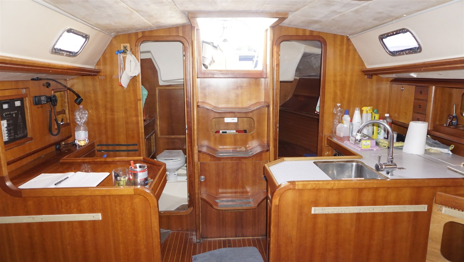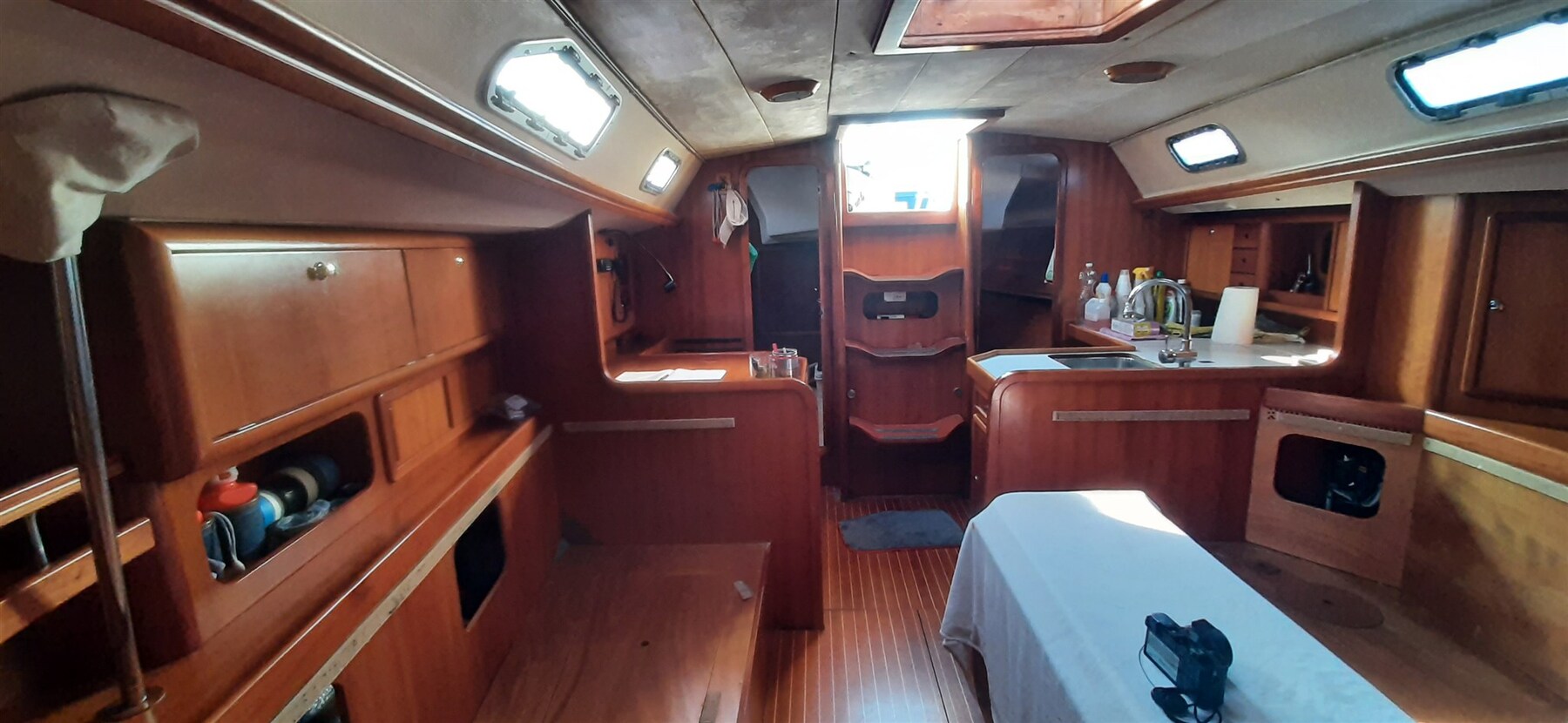 Anchor (15 kg + spare, 50 m chain), Water pressure pump, Shore power cable, Deck Shower, Solar panels, Gangway, Manual Bilge Pump, Teak Cockpit, Shorepower connector, Electric Windlass, swimming ladder, cockpit table, Winch (HARKEN), Windex.