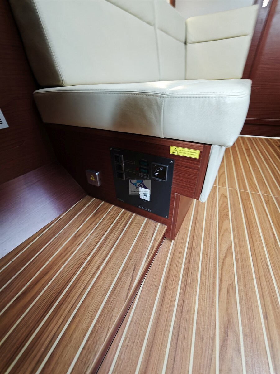 Anchor (Delta 16kg mit 30m galvanisierter Kette), Water pressure pump, 3 Batteries (je 160 Ah AGM), Deck Shower (warm/kalt), Twin Steering, Bow Thruster (12 V einziehbar inkl. Batterie), Solar panels (200 Watt), Platform (Badeplattform manuell mit Flexiteak), Teak Cockpit (Flexiteak, auch auf den Cockpitbänken), Shorepower connector, Electric Windlass (mit Fernbedienung und Ankerkettenzähler), swimming ladder, cockpit table (mit Staufach und Kühlschrank), 2 guard rails with gates, 2 Winch Electric (Lewmar 45 EST Evo Fallwinschen), Windex.