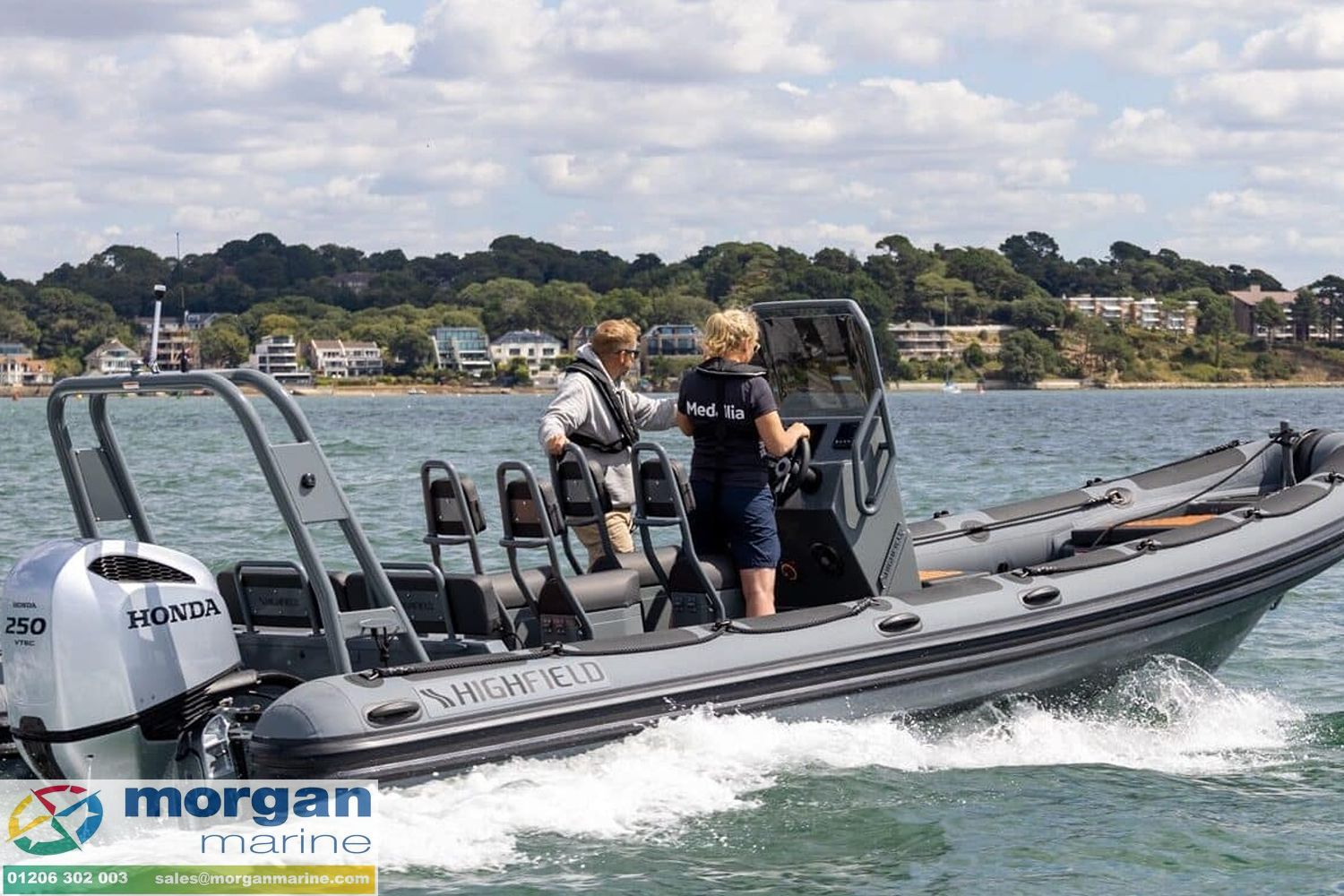 Highfield Patrol 760 aluminium RIB with Honda BF200 DXRU outboard and capacity of 12. The Highfield Patrol range of commercial quality RIBs are designed to work both excellently as a long distance family cruiser or a hardcore work boat. Built to withstand the toughest of conditions. The hull is built from 5083 aluminium plates with 6 and 10mm stringers. With their super deep V, wide chines and large diameter tube, they offer high manoeuvrability, high safety and a soft dry ride even in the roughest conditions. The range offers something for almost every requirement, from Sailing club support to Police and Rescue applications. The Patrol boats carry large loads and plane quickly and easily with little horse-power. For charter boat and commercial operators, the modular set-up option means that we can build a Highfield Patrol 760 with a layout that suits your needs. These boats are ideal pursuit craft or work boats and can be configured with different seating and console options. When safety, toughness & reliability really matter, the Patrol range should be your first port of call. With MCA rating & commercial coding available, the Patrol range is perfect for commercial chartering or working offshore too. Design category C. Black Tubes in Hypalon. NB - library photos may not reflect specification of boat.
