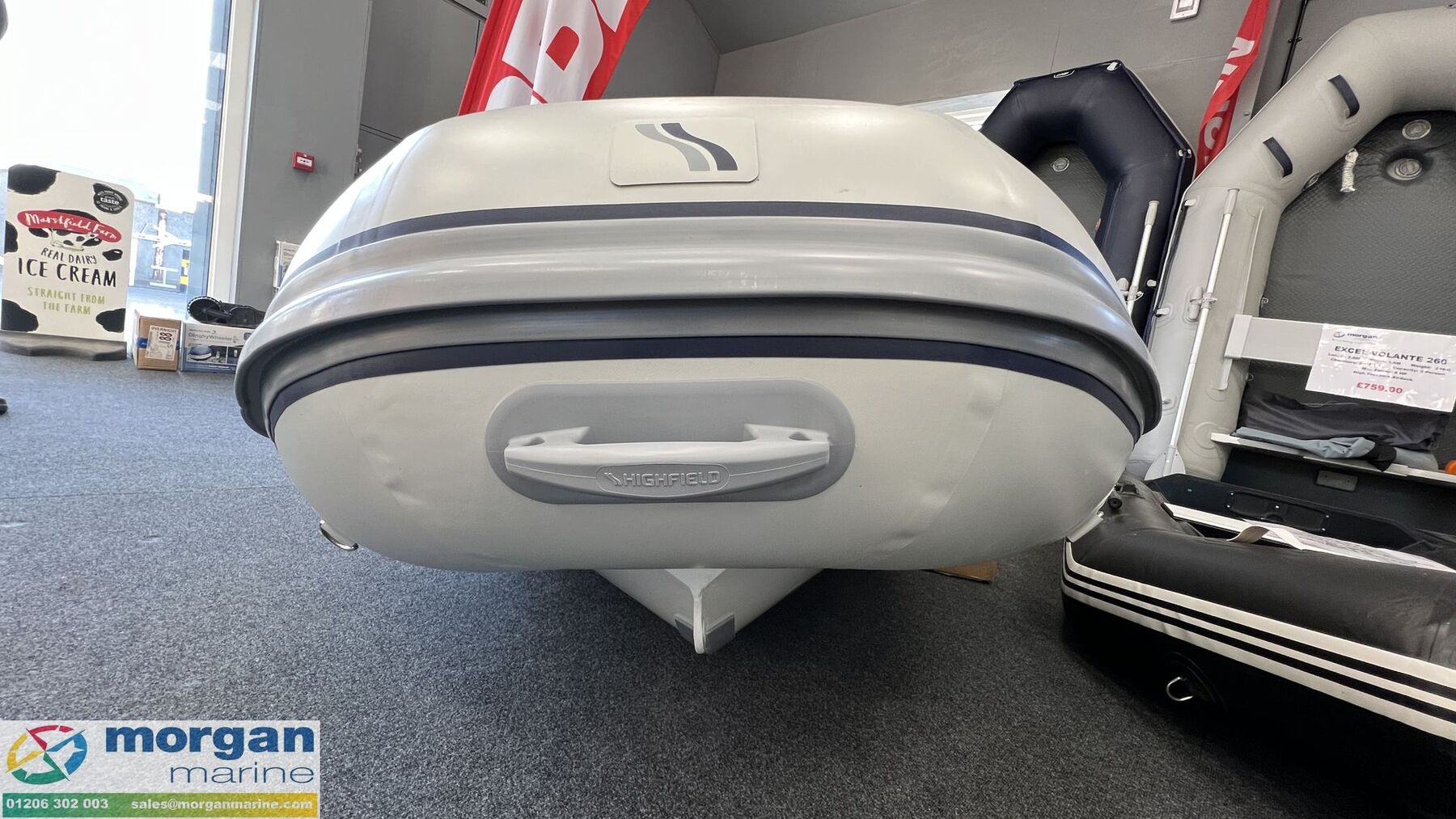Deck: Light grey PVC Mehler Tube: 44cm diameter. Welded seams. Flush mount non-return valves. High tensile chromated and power coated aluminium hull. Self-draining deck. Removable seat. Lifting points and towing eye. Tow brindle points. Anti-slip deck, Light weight rubbing strake and Full length keel guard