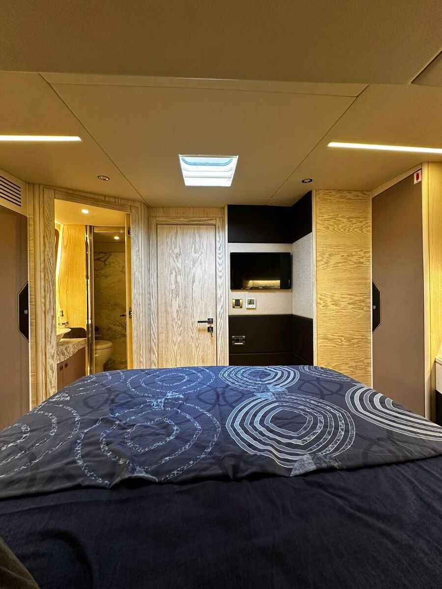 Chiller air conditioning throughout, Onan 11 kW generator, new 600 Ah lithium batteries, 650 W solar panels, 180 L/h watermaker, bow and stern thrusters, latest-generation Raymarine navigation (GPS / radar), full teak decks, hydraulic passerelle, fully equipped galley, dishwasher, 10 kg washing machine, Hertz sound system, night-vision and stern cameras.