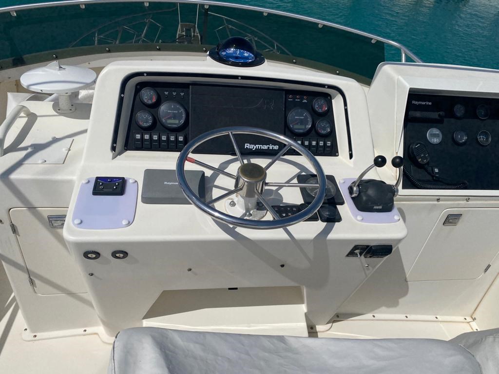 Angolo barra, Comando motori elettronico, 2 Computer di bordo (Volvo), Contamiglia (Raymarine), Ecoscandaglio (Raymarine), GPS (Raymarine), Plotter (Raymarine), Radio VHF (VHF Fly e VHF di rispetto in dinette).