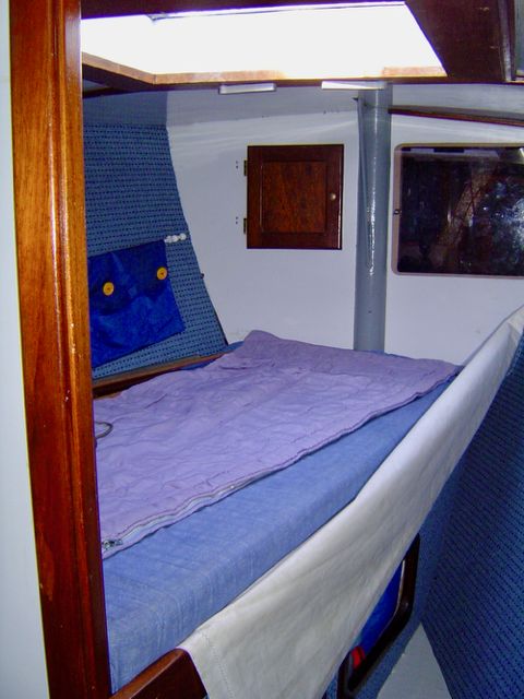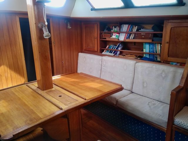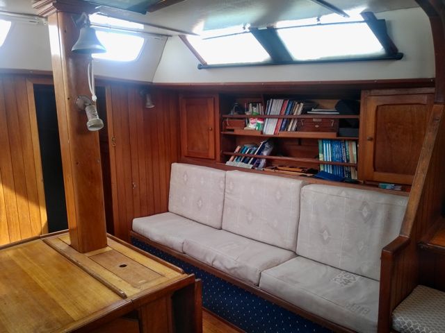 El interior es luminoso y amplio, con una timonería interior que ofrece visibilidad panorámica y una rueda interior conectada mecánicamente con la rueda exterior. El salón cuenta con una gran mesa modular rodeada de múltiples espacios de almacenamiento. La cocina está equipada con cocina ENO, calentador de agua a gas, frigorífico y tres depósitos de agua con un total de 320 litros. La cabina de popa ofrece una amplia cama doble y muchos armarios, mientras que la cabina de estribor dispone de dos literas convertibles. En proa, un baño con bañera y ducha de agua caliente da acceso a la cabina delantera con una cama semi-doble y un enorme cofre para velas y equipos.