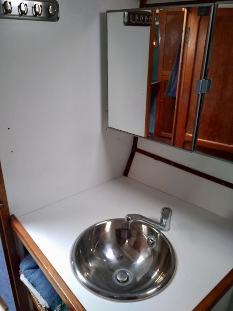 The interior is bright and spacious, featuring an inside wheelhouse offering panoramic visibility and an interior helm mechanically linked to the outside steering. The saloon includes a large convertible table surrounded by generous storage. The galley is equipped with an ENO stove, gas water heater, refrigerator, and three freshwater tanks totalling 320 litres. The aft cabin offers a large double berth and significant storage, while the starboard cabin provides two convertible bunks. Forward, a bathroom with a bath/shower and hot/cold water leads to the forward cabin with a semi-double berth and a very large sail locker.
