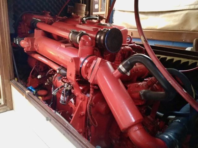 El motor es un Fornaut diésel de 83 CV con unas 3.200 horas, alimentado por un depósito principal de 600 litros integrado en la quilla y un depósito diario de 70 litros. El acceso al motor es excelente desde las cabinas laterales. El circuito de gasoil dispone de pre-filtro y doble filtración, la bomba de agua dulce fue sustituida en 2023 y la hélice tripala Vetus está totalmente protegida por el timón apoyado sobre el codaste.
