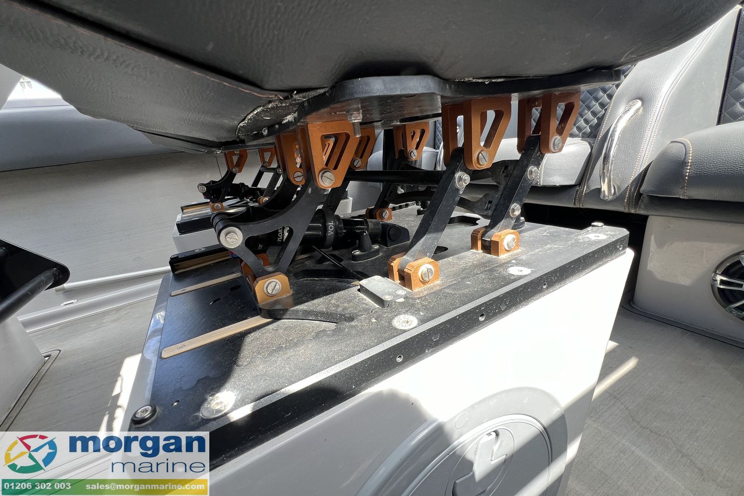 Cockpit: Vengeance console with low profile windscreen, engine display and controls. Livorsi racing throttle. Pilot and co- pilot bolster seats. 3 Person Ring racing high back bench style bolster seats with Skydeck Shock to stern. Bow U-shaped cushion seating with hydraulic height adjustable dining table which converts into sun bed.
