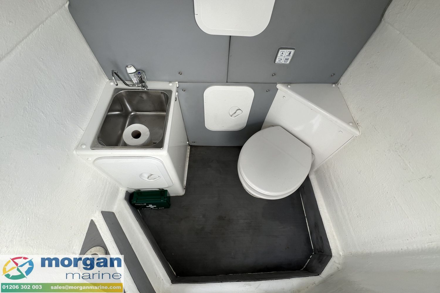 Cabin: Electric head in console with holding tank, basin and hatch.