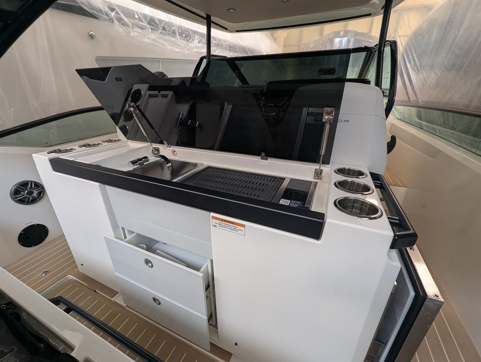 Angolo barra, Computer di bordo (Mercury), Contametri catena, Contamiglia (Simrad), Display (Simrad), Ecoscandaglio (Simrad), GPS (Simrad), Plotter (Simrad), Quadro comandi, Radio VHF (Simrad), 2 Sedile Copilota.