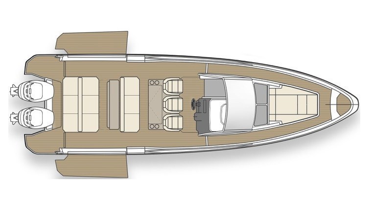 2 Engine Alarm, Bilge Alarm, Alternator, Water pressure pump, Batteries (maggiorate), Teak Side Decks (in Flexiteek), Shore power cable, Electric Flaps, Hard top, Flaps Indicators, Washbasin in the cockpit, Courtesy Lights, Fenders, Platform, Automatic Bilge Pump, Teak deck (in Flexiteek), Entry door, Teak Cockpit (in Flexiteek), Shorepower connector, Voltage Rectifier, Electric Windlass, swimming ladder, cockpit table (convertibile in prendisole), Horn.
