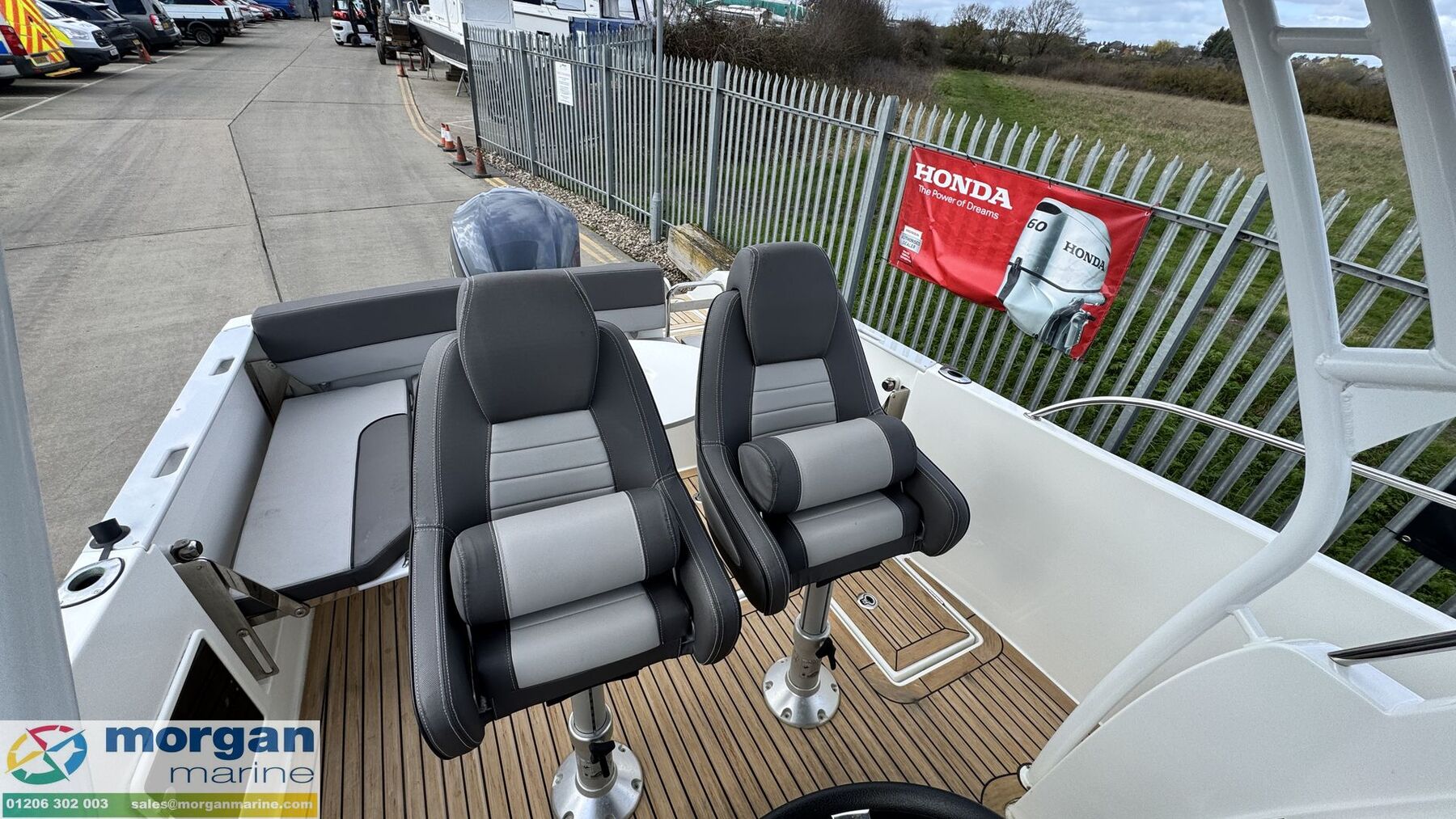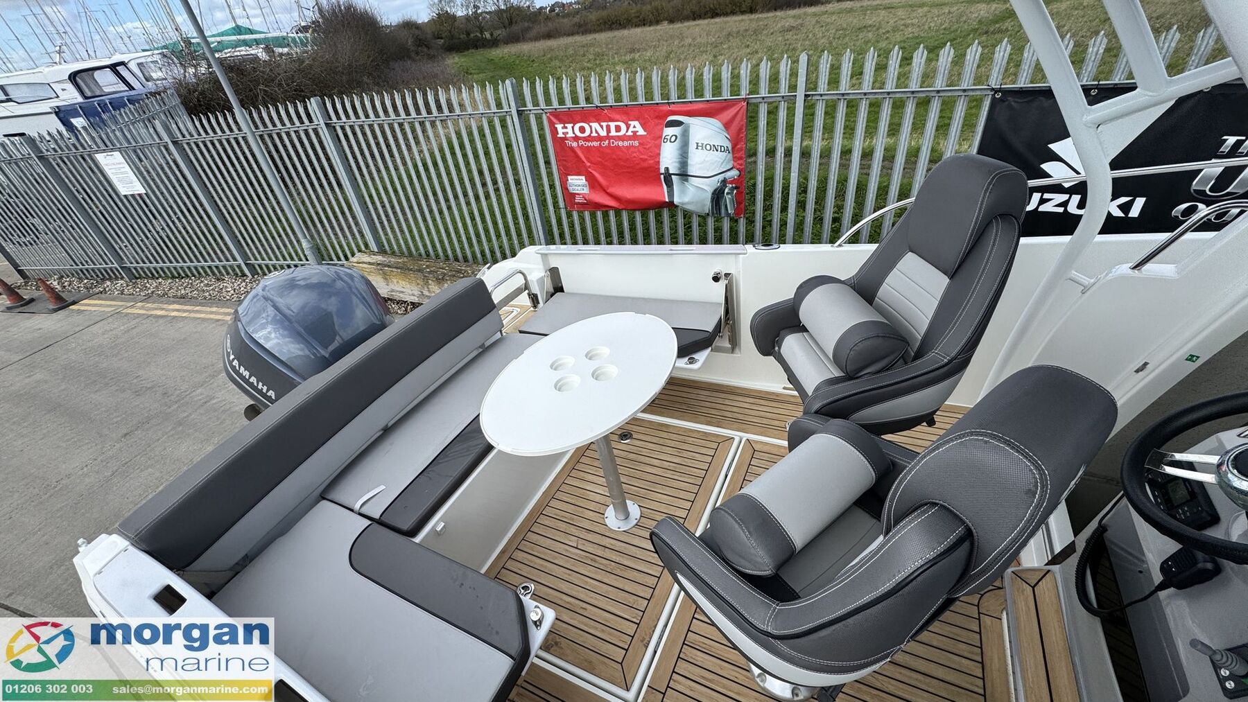 Cockpit: Pilot and co-pilot adjustable bolster seats. Dash with full engine controls, electronics and compass. Aft cockpit folding bench with cushions and backrest + luxury port and starboard folding side benches with cushions+ cockpit table. 2x deck cockpit lockers. Easy access to open bow with U-shape cushioned seating + seat in-front of console + storage. Cockpit stern gate.