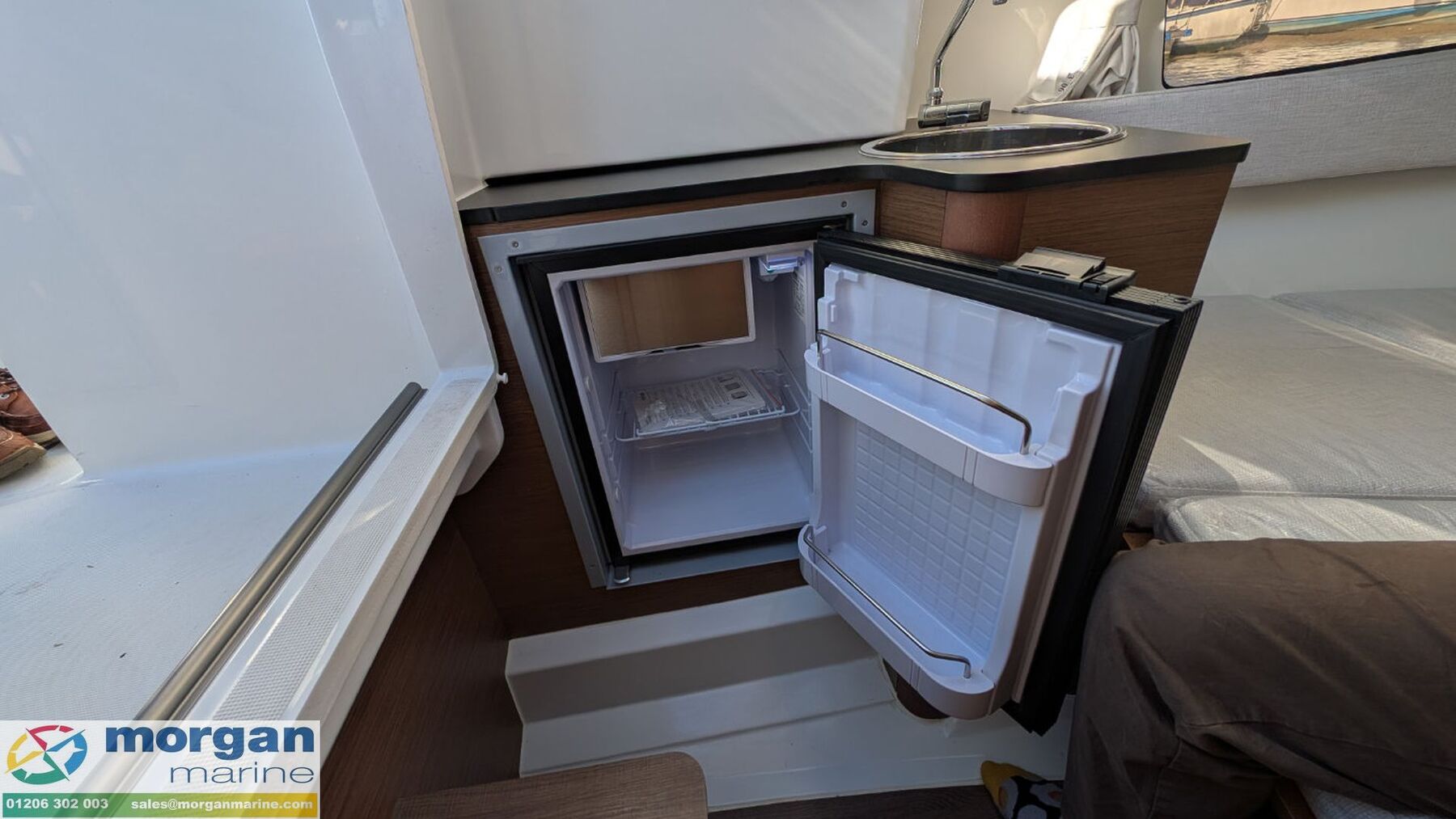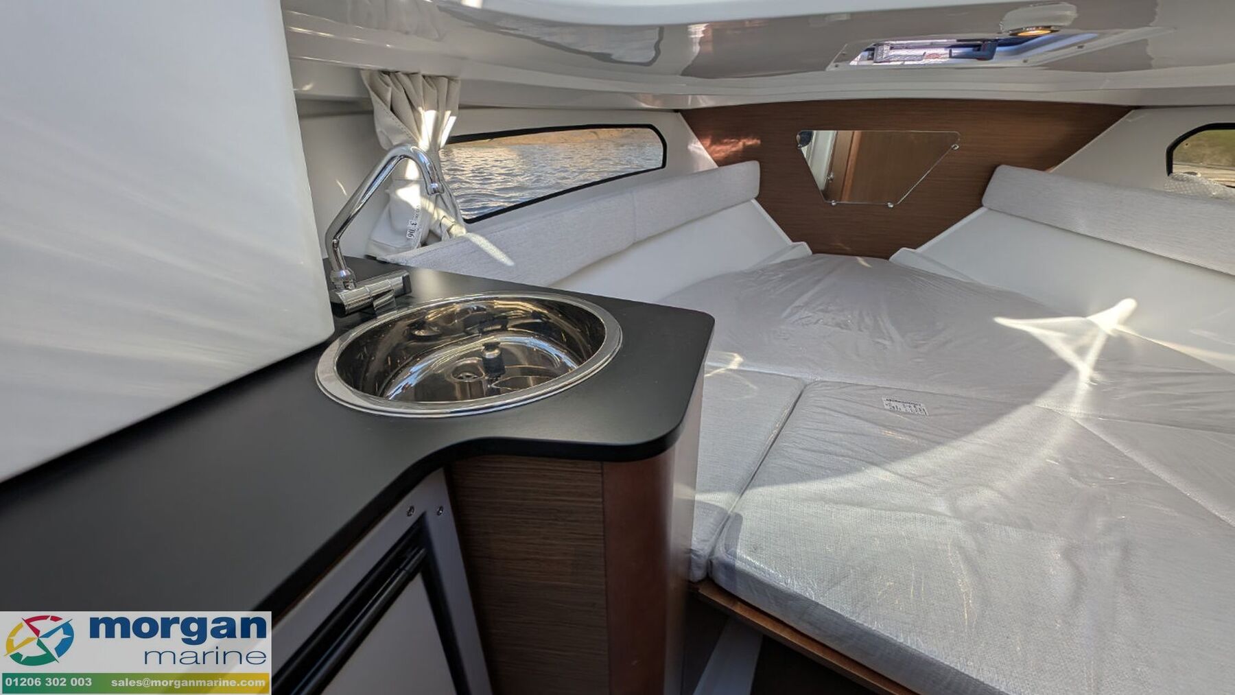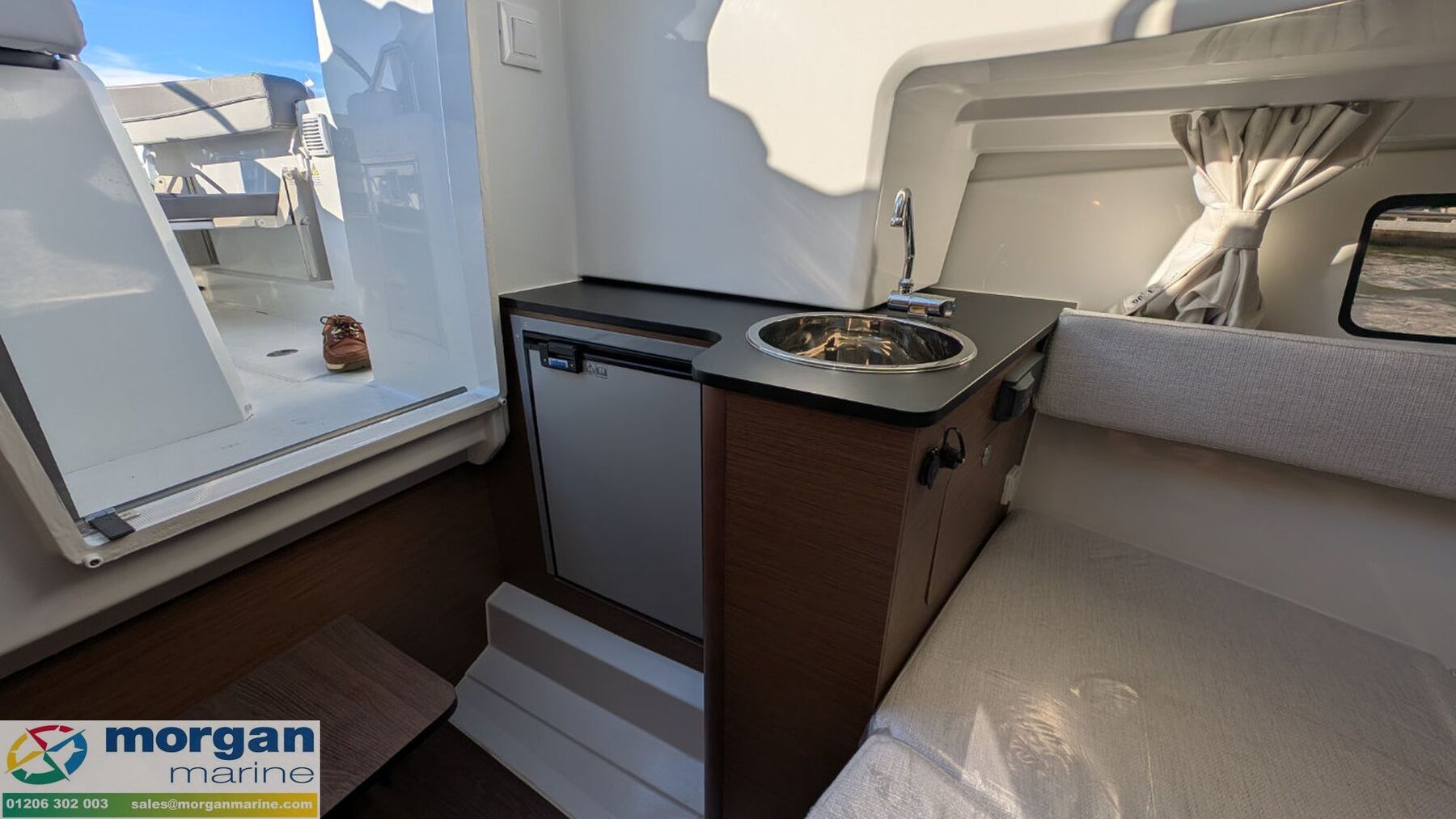 Cabin: Black transparent sliding plexi door. 2 berth cabin with double berth complement, storage + shelves, cushions, overhead lights, opening deck hatch, curtains and hull windows + porthole in console. Interior galley on port side with fridge and sink. Separate compartment on starboard side with marine toilet.