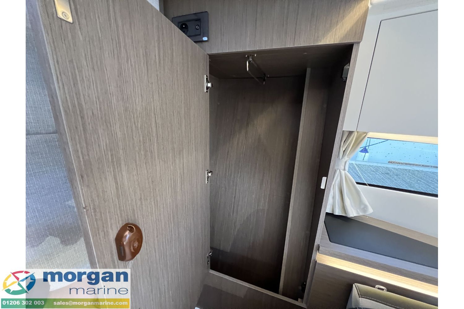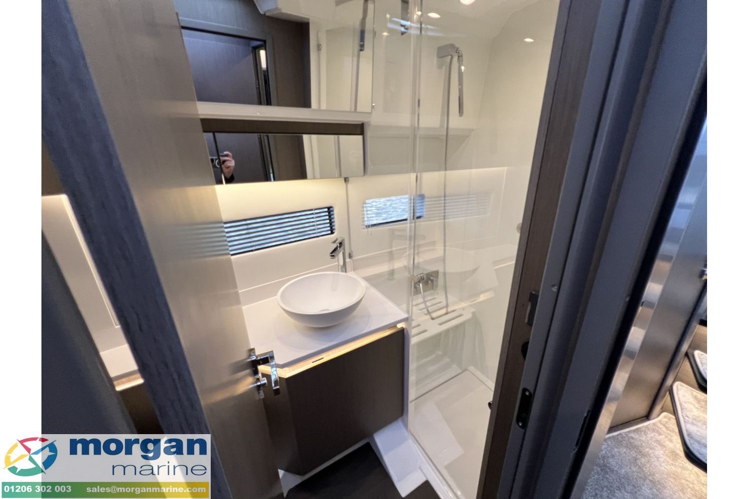 Cabin: Forward cabin with double berth (slatted base) + headband cushion, roof hatch, opening porthole, hull + deck windows, LED lights + reading lamps, wardrobe, shelves and lockers. 2nd cabin (port side) with 2x single berths, opening porthole, wardrobe and LED lights + reading lamps + removable carpet. 3rd cabin with 2x single berths, opening porthole, wardrobe, LED lights + reading lamps + removable carpet. Two toilet compartments - both with electric flush toilet, separate shower, washbasin and opening porthole.