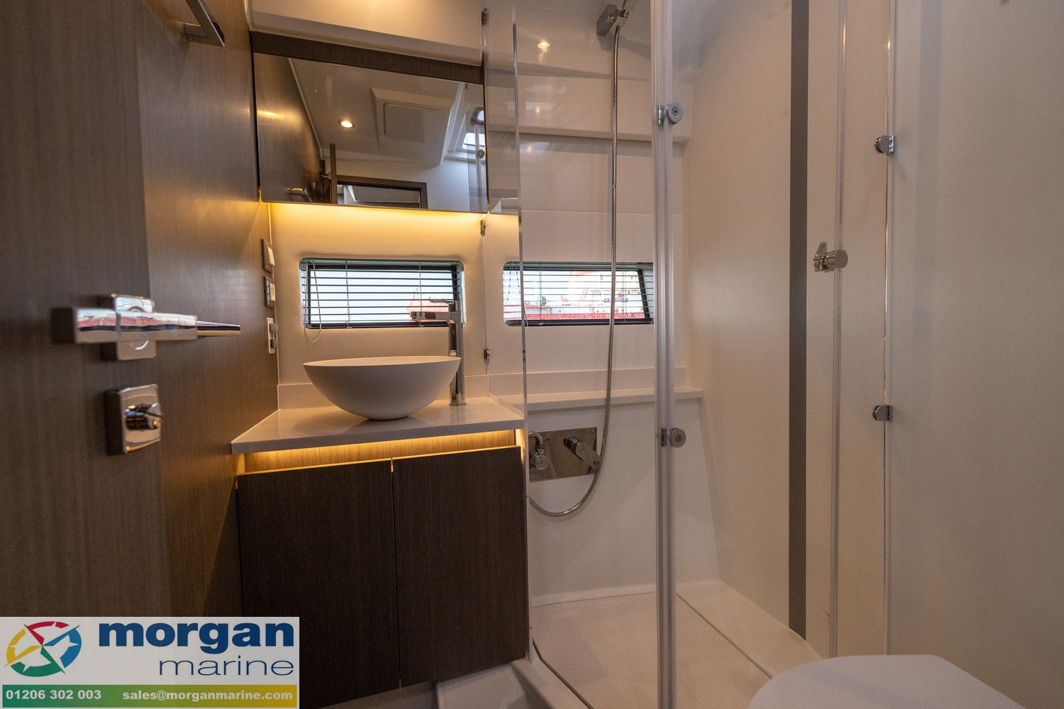 Cabin: Forward cabin with double berth + headband cushion, roof hatch, opening porthole, hull + deck windows, LED lights + reading lamps, wardrobe, shelves and lockers. 2nd cabin (port side) with 2x single berths, opening porthole, wardrobe and LED lights + reading lamps. 3rd cabin with 2x single berths, opening porthole, wardrobe, LED lights + reading lamps. Two toilet compartments - both with electric flush toilet, separate shower, washbasin and opening porthole. Removable carpets in cabins and saloon. Prefit for TV in front cabin and saloon.