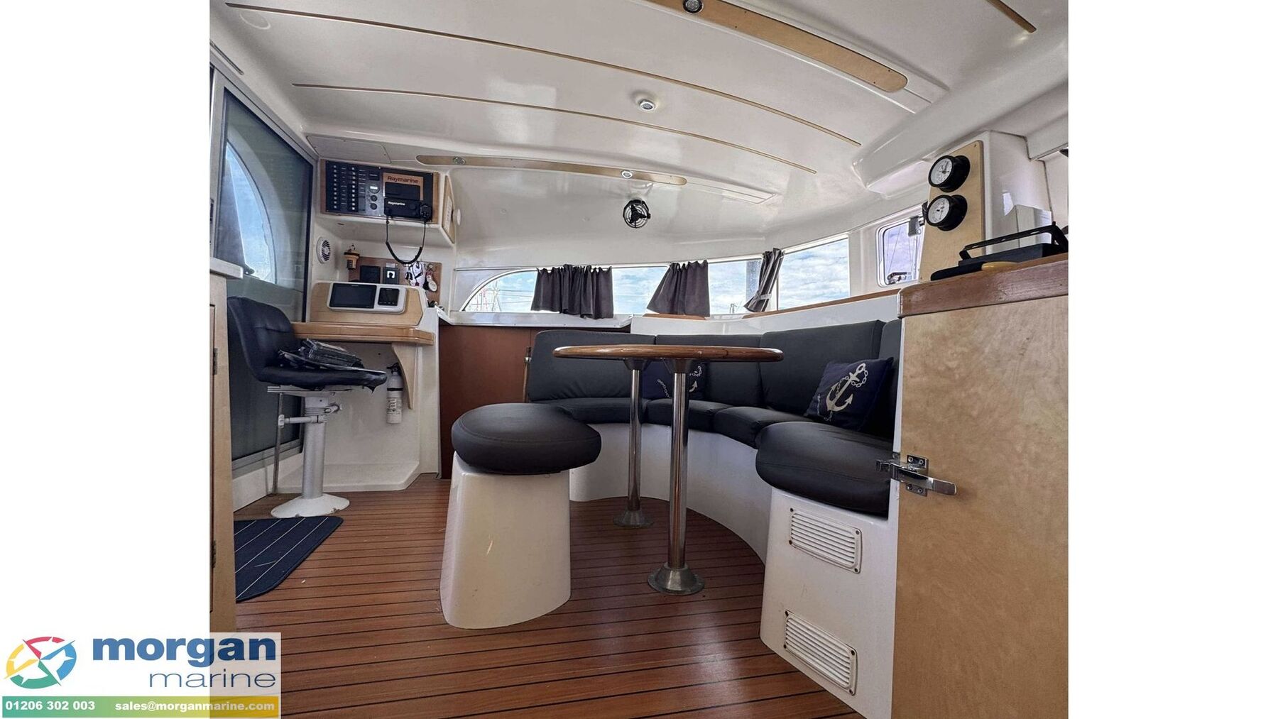 Cockpit: Large cockpit L-shaped seating with table. New deck hatches. New front windows. Helm position to port side with steering wheel and engine controls. Entry to cabin area through sliding glass door. Large self draining cockpit. Galvanic protection.