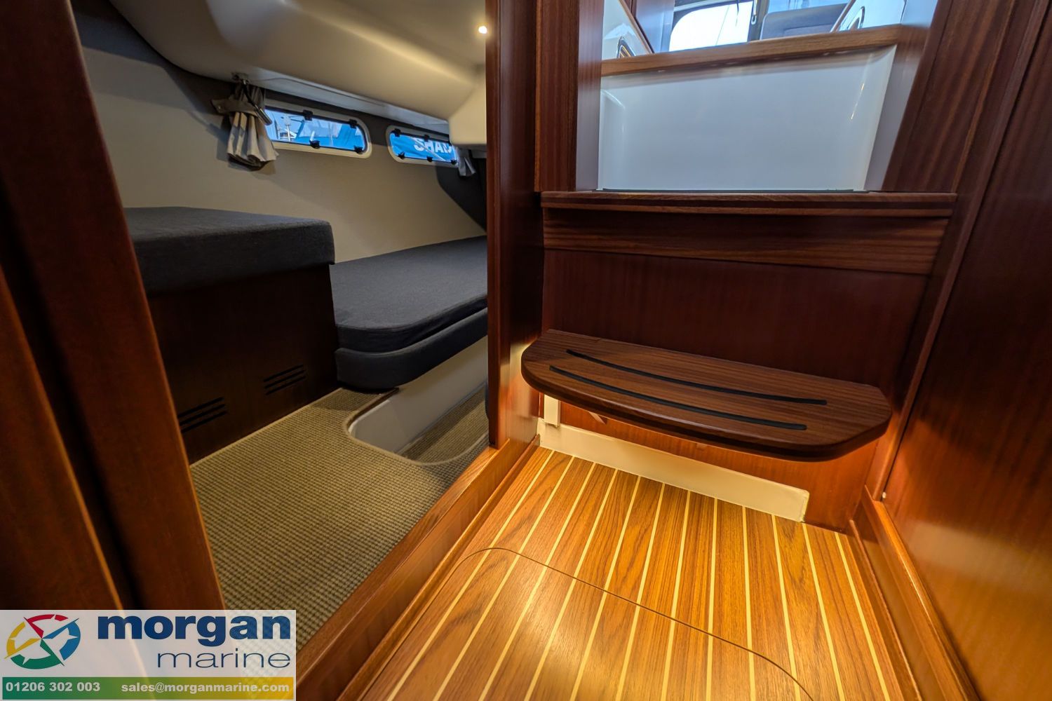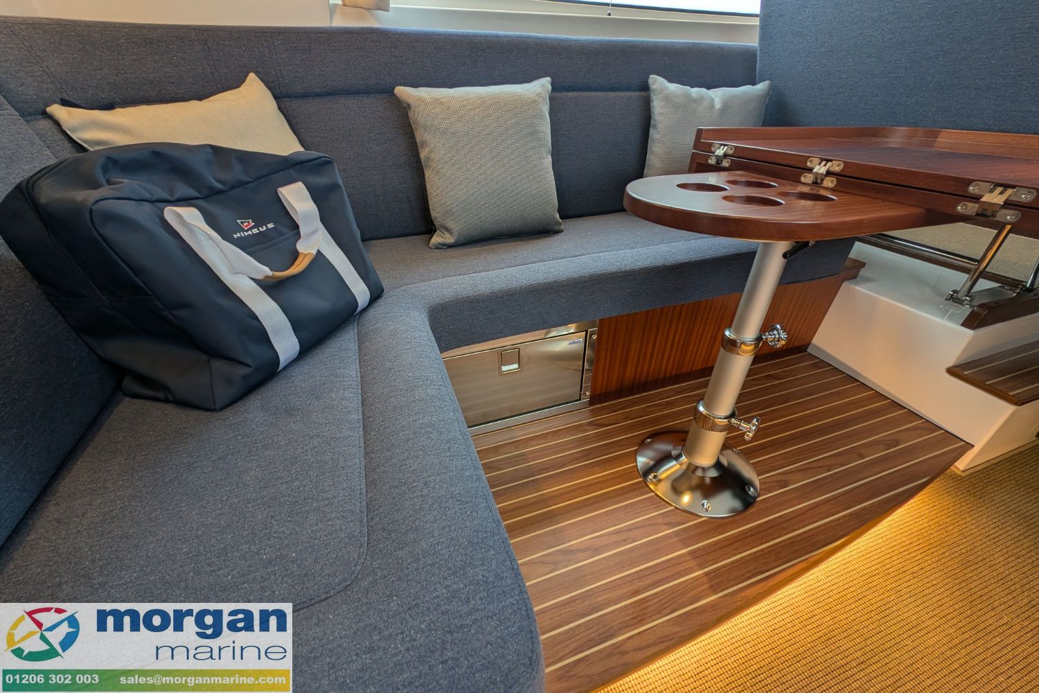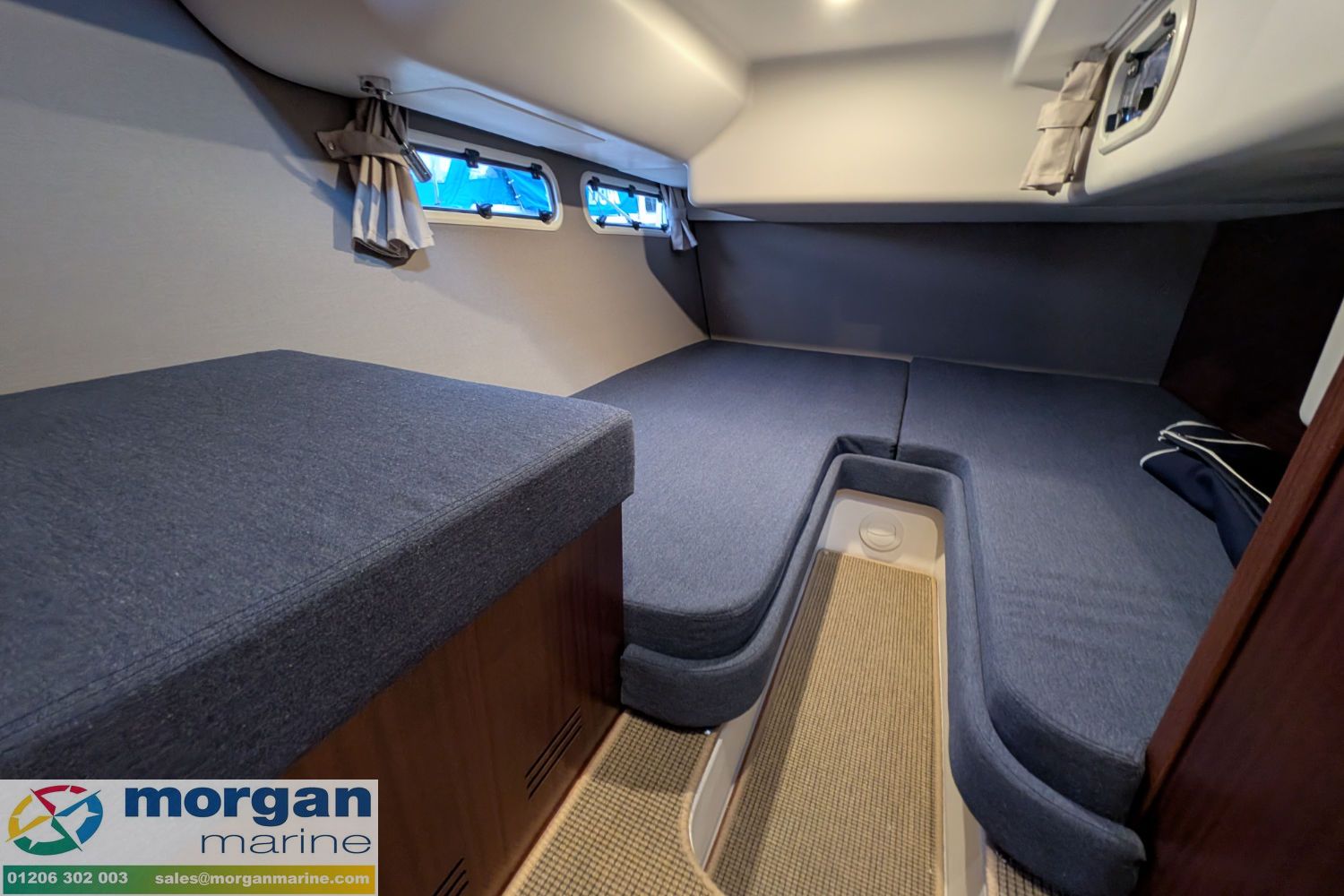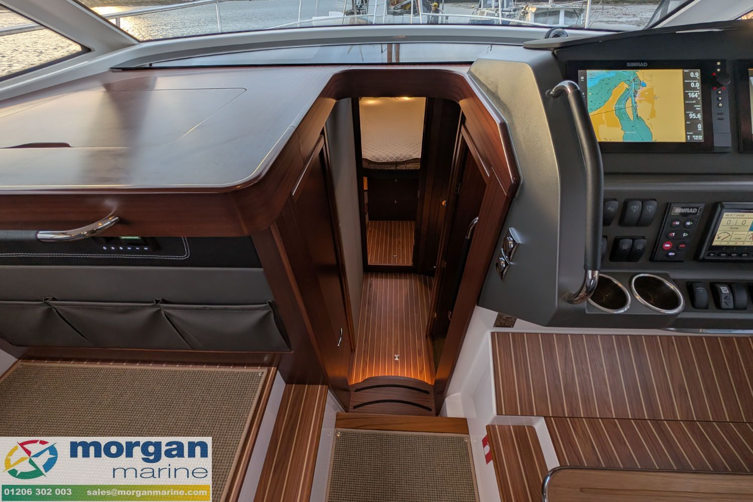 Cockpit: At the helm, the upgraded twin Simrad NSS 12” EVO 3S plotters offer detailed, reliable navigation. The station is further enhanced by a full Simrad autopilot system (including NAC2, OP12 control, rudder feedback, and hydraulic pump), making longer journeys effortless. Visibility is aided by interval wipers. The boat is also fitted with a Volvo Penta trip computer and depth / log instrumentation for essential performance feedback. The wheelhouse has a large aft door, a large sliding aft door to the starboard side deck and a large sliding glass roof with blinds. Port side forward seating and starboard side helm position with 2 person convertible bolster seats for sitting / standing. Port side C shape saloon with table and starboard side galley with gas oven and cooktop, sink, plenty of cupboards + extra Isotherm CR36 box-type 36L fridge - under aft sofa.