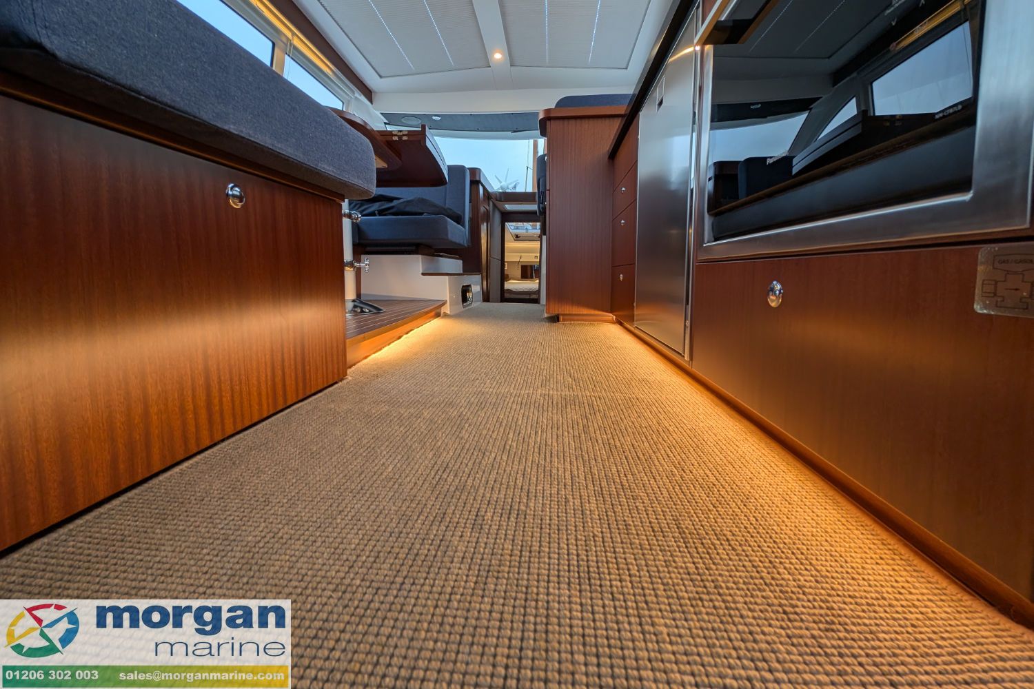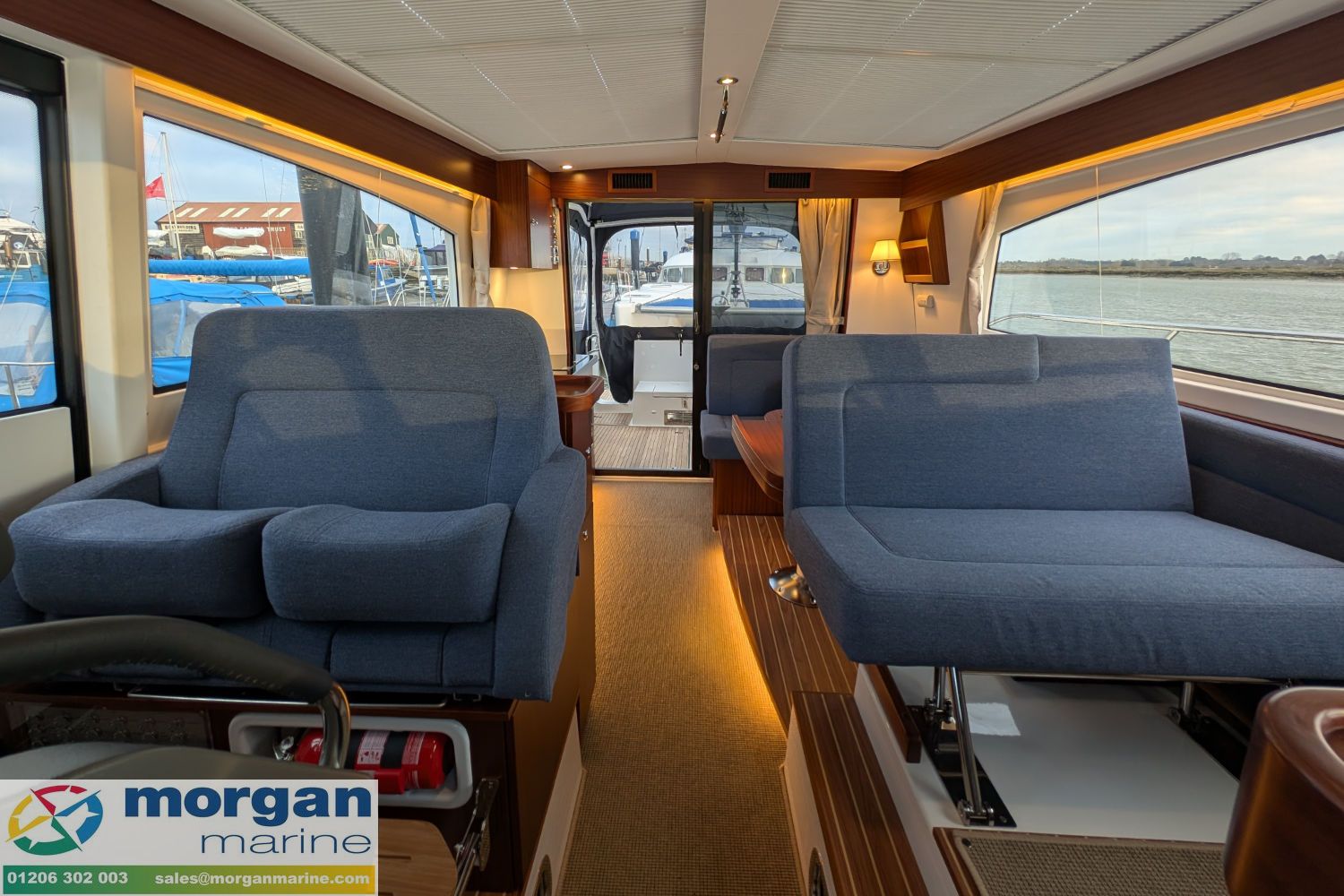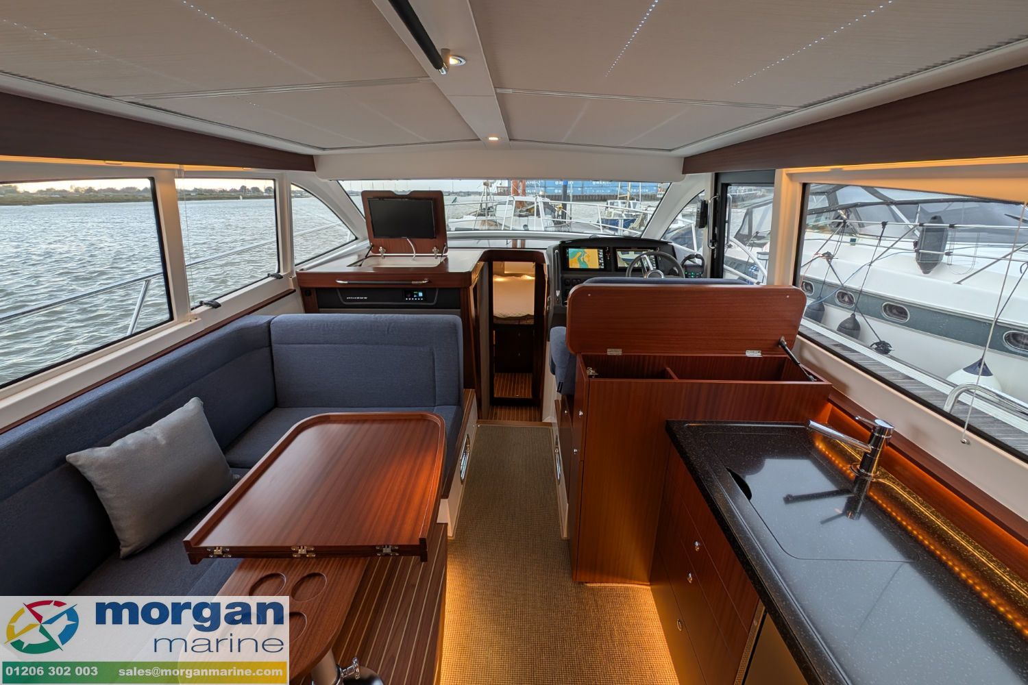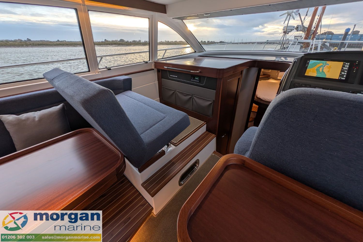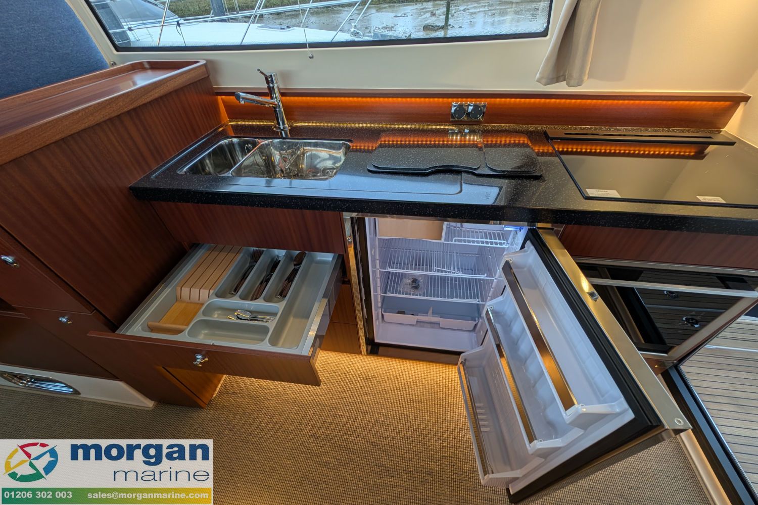 Cockpit: At the helm, the upgraded twin Simrad NSS 12” EVO 3S plotters offer detailed, reliable navigation. The station is further enhanced by a full Simrad autopilot system (including NAC2, OP12 control, rudder feedback, and hydraulic pump), making longer journeys effortless. Visibility is aided by interval wipers. The boat is also fitted with a Volvo Penta trip computer and depth / log instrumentation for essential performance feedback. The wheelhouse has a large aft door, a large sliding aft door to the starboard side deck and a large sliding glass roof with blinds. Port side forward seating and starboard side helm position with 2 person convertible bolster seats for sitting / standing. Port side C shape saloon with table and starboard side galley with gas oven and cooktop, sink, plenty of cupboards + extra Isotherm CR36 box-type 36L fridge - under aft sofa.