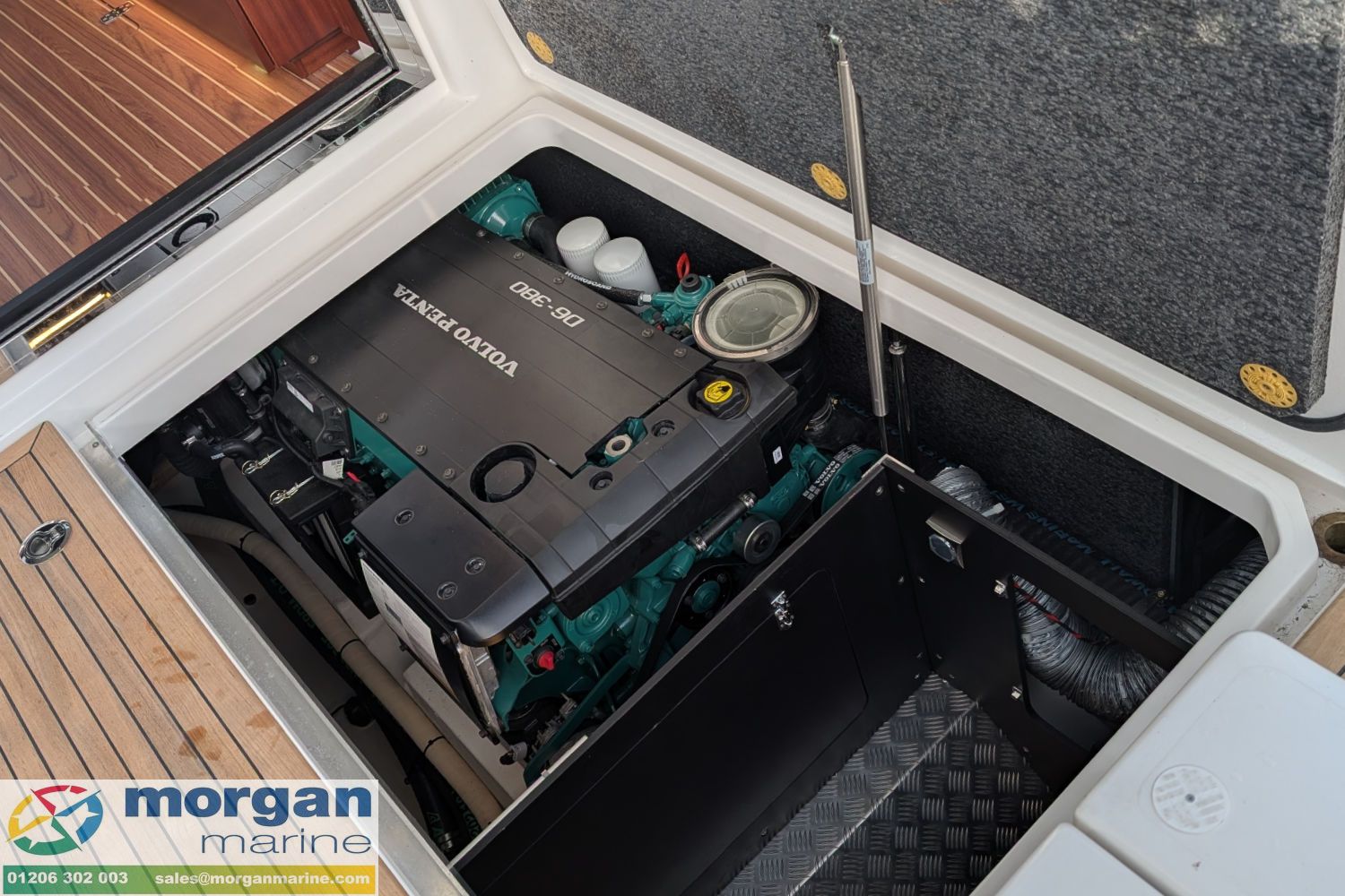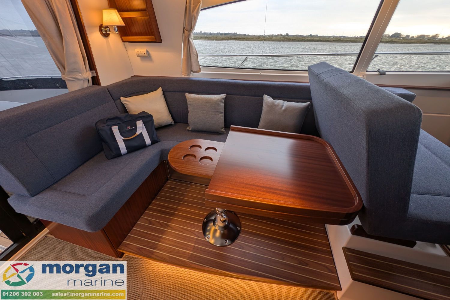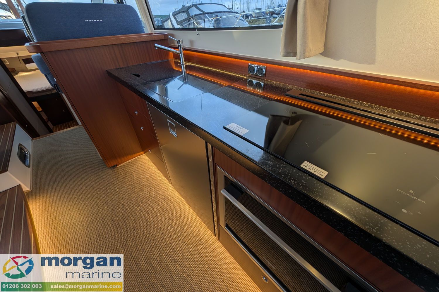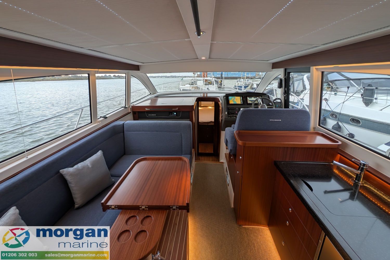 Cockpit: At the helm, the upgraded twin Simrad NSS 12” EVO 3S plotters offer detailed, reliable navigation. The station is further enhanced by a full Simrad autopilot system (including NAC2, OP12 control, rudder feedback, and hydraulic pump), making longer journeys effortless. Visibility is aided by interval wipers. The boat is also fitted with a Volvo Penta trip computer and depth / log instrumentation for essential performance feedback. The wheelhouse has a large aft door, a large sliding aft door to the starboard side deck and a large sliding glass roof with blinds. Port side forward seating and starboard side helm position with 2 person convertible bolster seats for sitting / standing. Port side C shape saloon with table and starboard side galley with gas oven and cooktop, sink, plenty of cupboards + extra Isotherm CR36 box-type 36L fridge - under aft sofa.