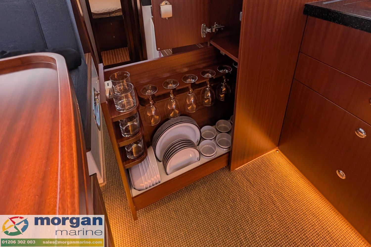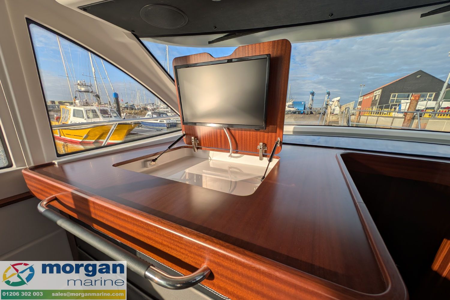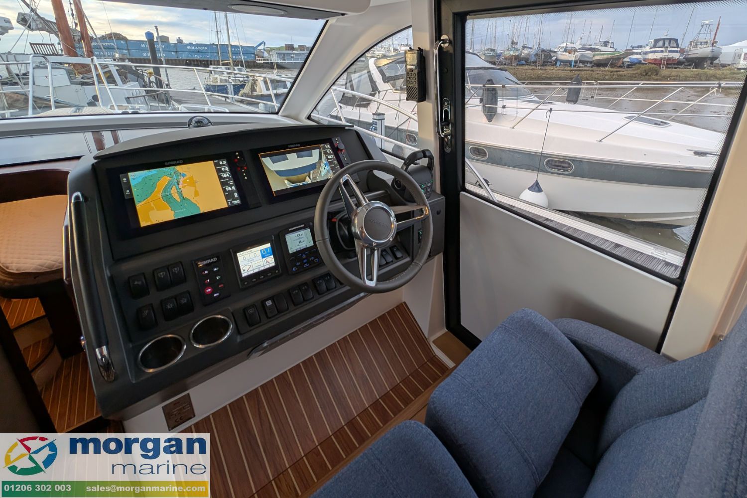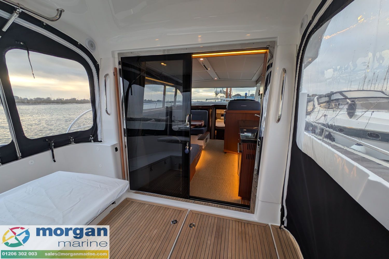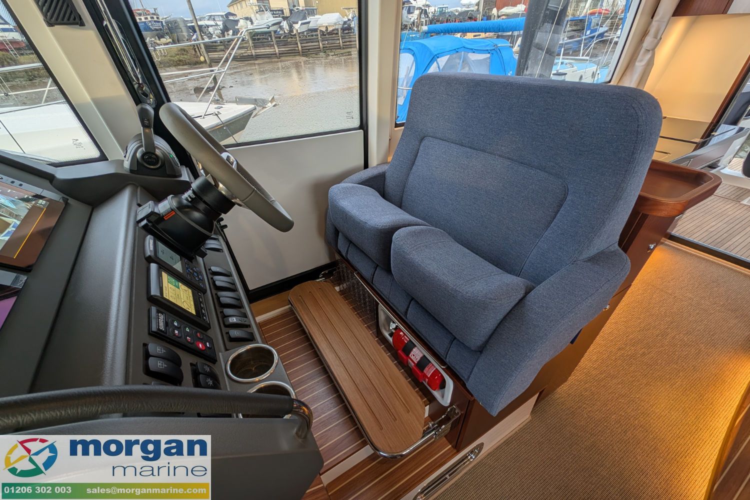 Cockpit: At the helm, the upgraded twin Simrad NSS 12” EVO 3S plotters offer detailed, reliable navigation. The station is further enhanced by a full Simrad autopilot system (including NAC2, OP12 control, rudder feedback, and hydraulic pump), making longer journeys effortless. Visibility is aided by interval wipers. The boat is also fitted with a Volvo Penta trip computer and depth / log instrumentation for essential performance feedback. The wheelhouse has a large aft door, a large sliding aft door to the starboard side deck and a large sliding glass roof with blinds. Port side forward seating and starboard side helm position with 2 person convertible bolster seats for sitting / standing. Port side C shape saloon with table and starboard side galley with gas oven and cooktop, sink, plenty of cupboards + extra Isotherm CR36 box-type 36L fridge - under aft sofa.