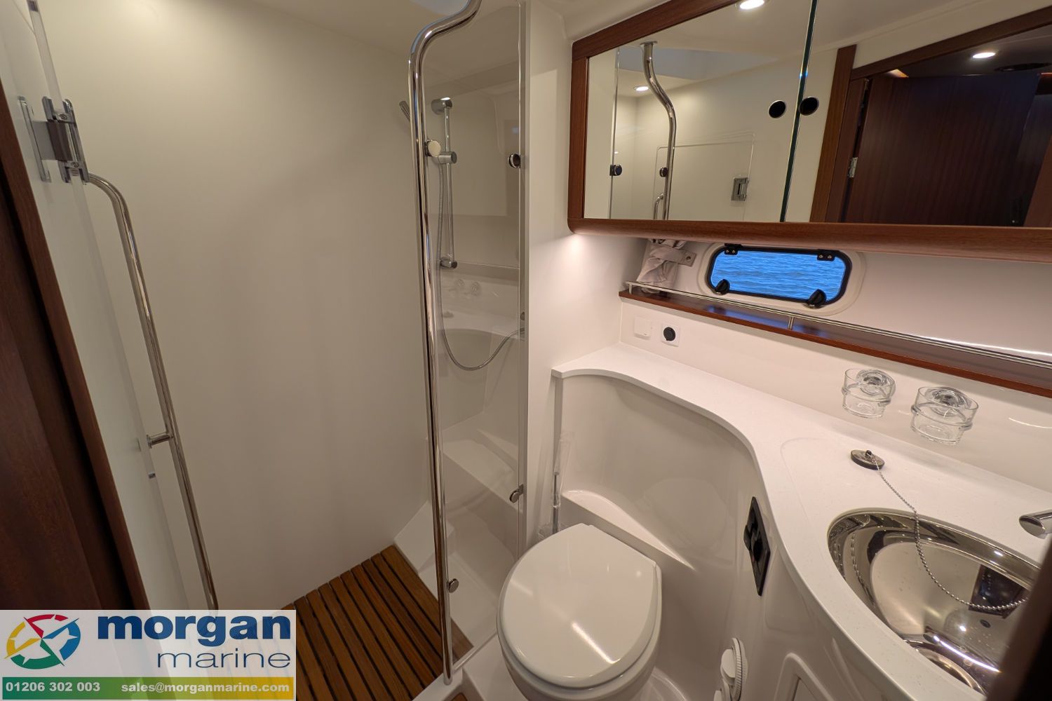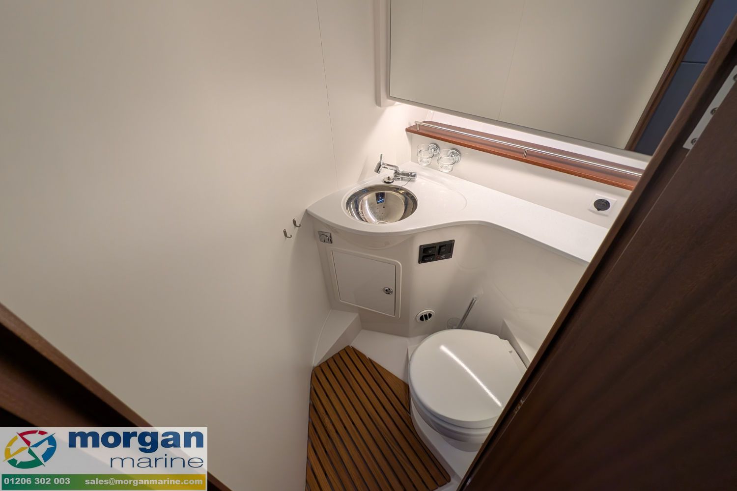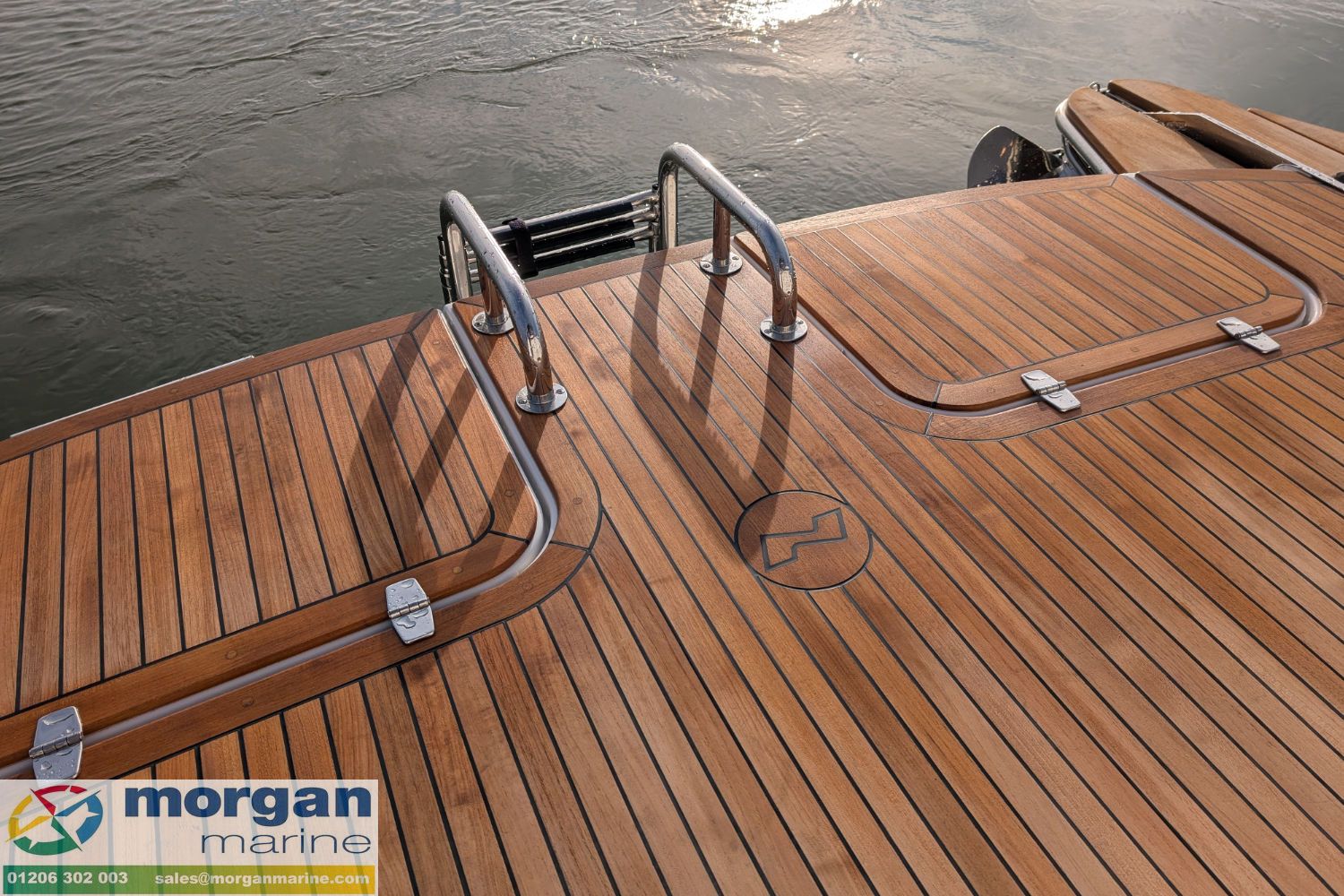 Cabin: Inside, the boat features warm mahogany panelling and grey upholstery for a timeless, welcoming feel. The front cabin boasts an exclusive coil mattress and extra topper for a luxurious night’s sleep, with additional mattress toppers in the port and starboard guest cabins for enhanced comfort. The saloon includes a convertible bed arrangement, and the cabin is illuminated by LED lighting throughout. The Nimbus exclusive dinner set (for 6) adds a premium touch to onboard dining. Toilet and shower room on port side. Additional toilet on starboard side - both electric flush.