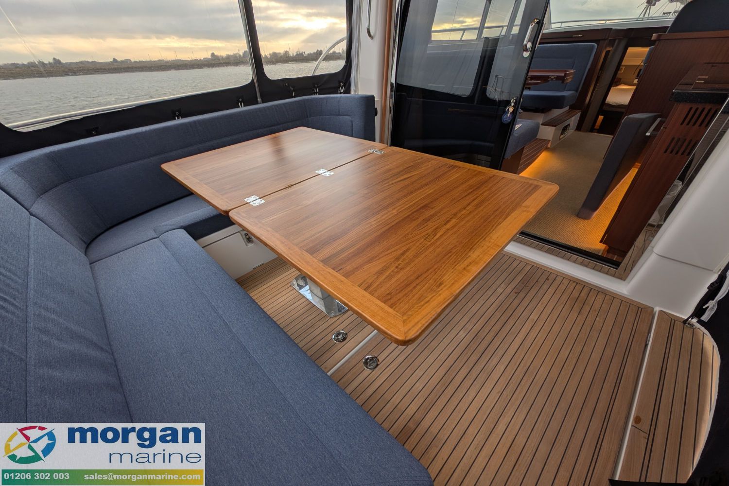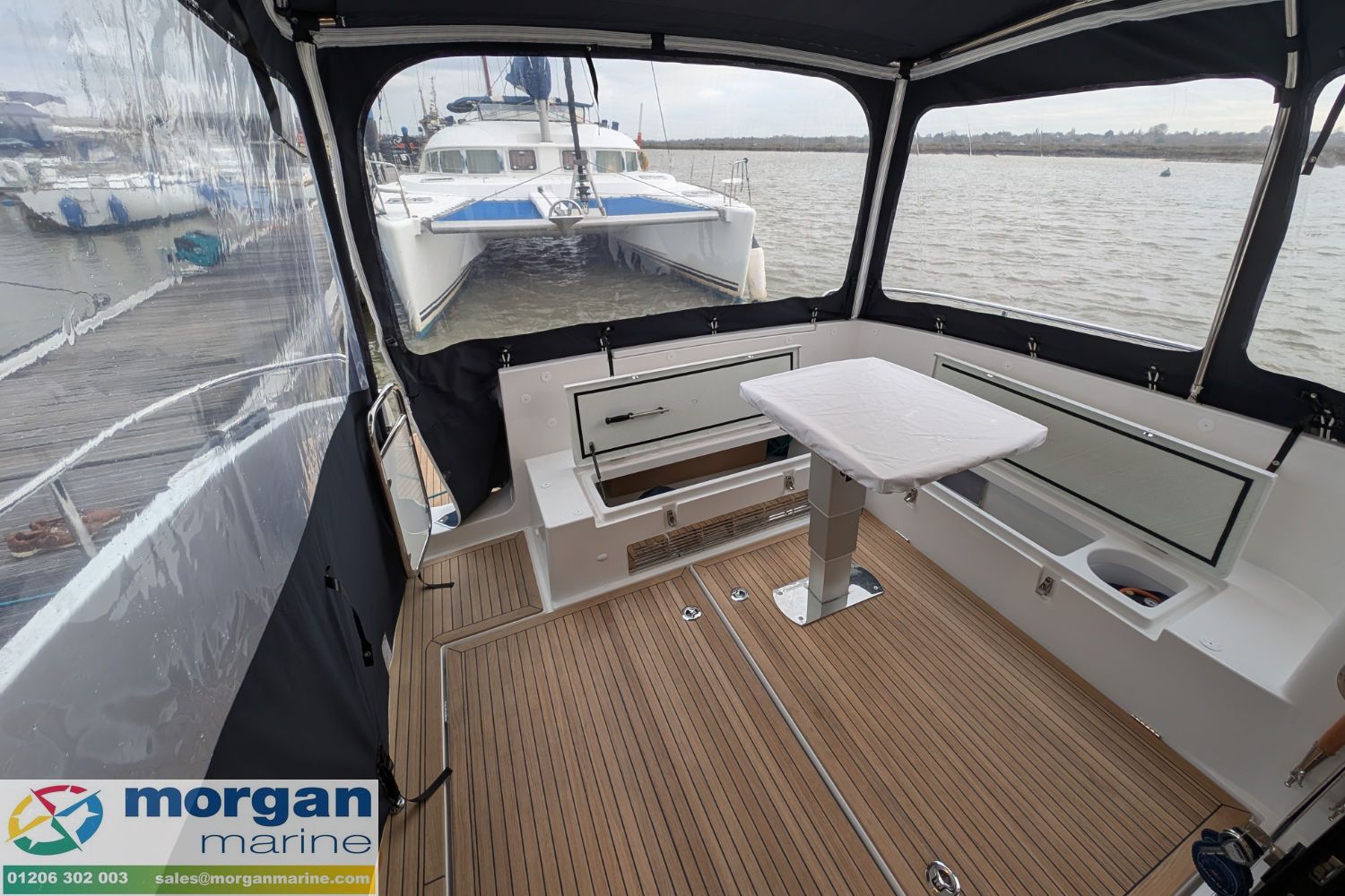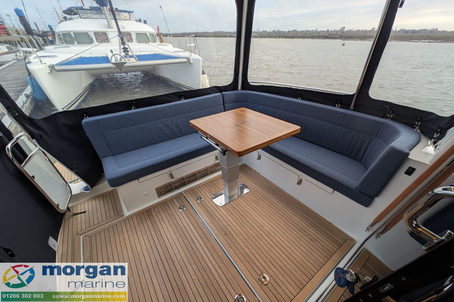 Deck: This 405 Coupe features eco-teak decking with white caulking throughout, including the port sidedeck, creating a classic yet low-maintenance finish. A light grey aft deck canopy provides protection in all weather, while grey outdoor cushions and sunpads on the foredeck offer inviting lounging space. The included mooring package comprises high-quality storm white/grey mooring lines, four fenders with Nimbus covers, and a spare anchor bag. Practical touches like the shower on the transom (hot and cold water), and L shape seating + convertible table / sunbed add comfort and convenience on board.