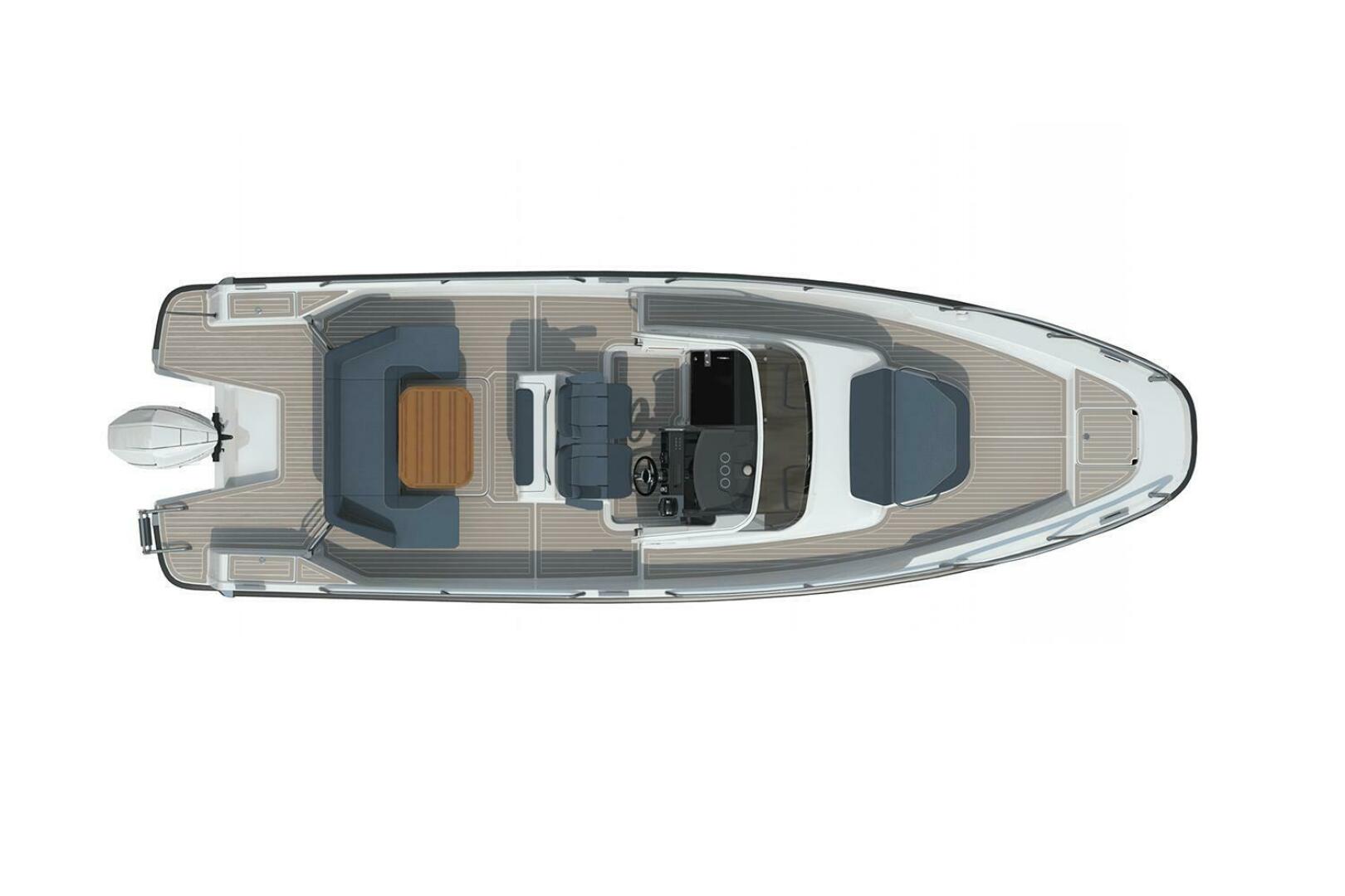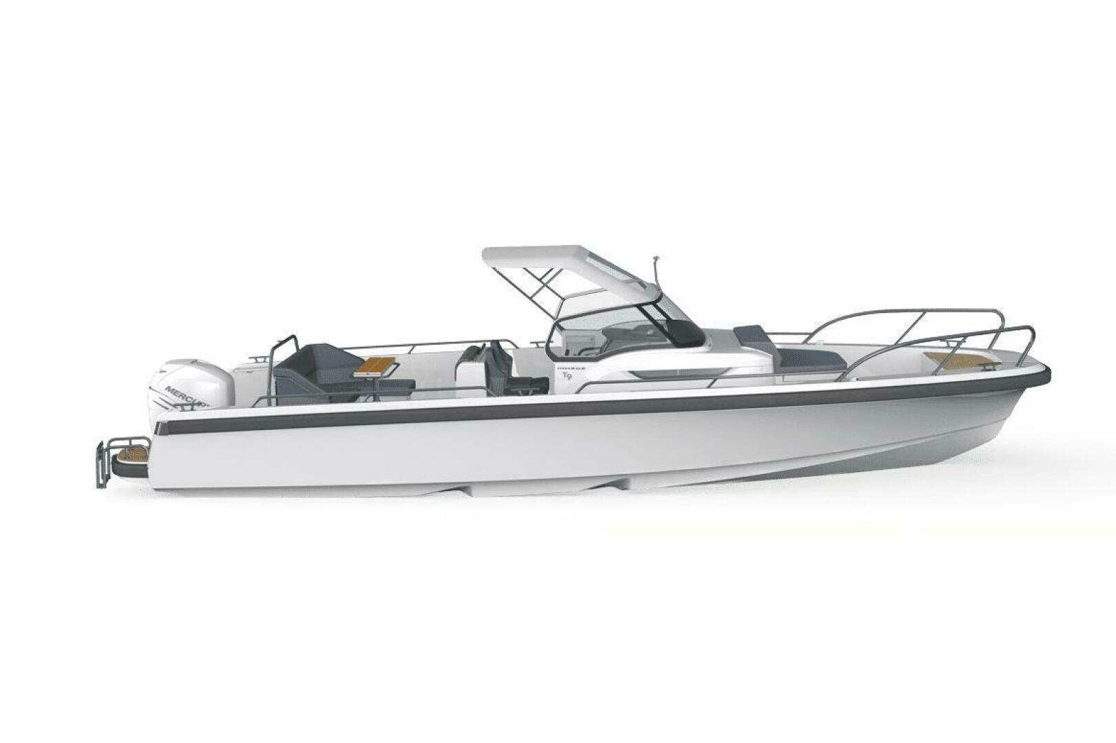 The T9 is equipped with twin Mercury FourStroke V6 225 outboard engines. The aft deck u-sofa with seating for 5 easily converts to a sunbed. The boat is available with the optional T-top design. The helm features twin 12″ chart plotters. The foredeck features a large loading hatch with access to the cabin.