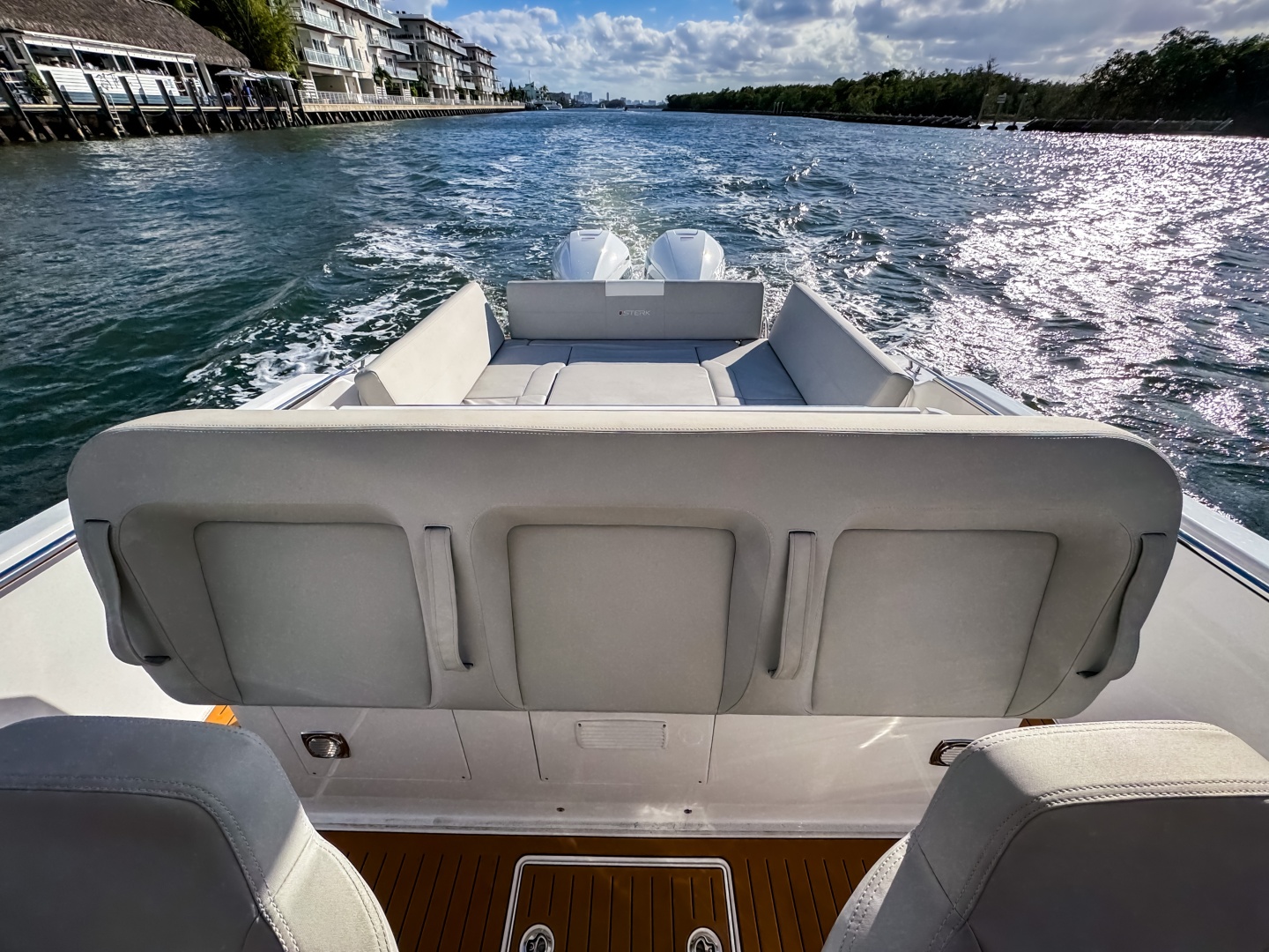 The driver’s position feels ergonomic, intuitive, and visually stunning. Sport Seats with flip-up bolsters and side support allow seated and standing helming. Angled dash designed for full visibility and glare reduction, even at high speed.