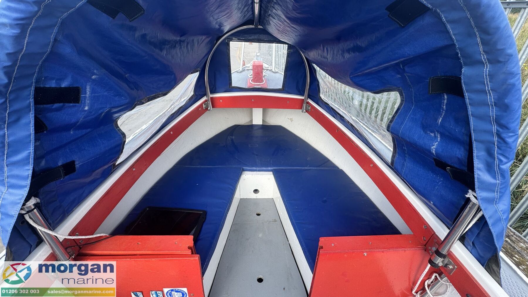 Deck: Auxiliary bracket. GRP hull. Spray hood canopy. Partial overall mooring cover. Anchor and rope. Bow roller. Fenders and lines. Boat hook. 1x Oar. Bow bollard cleat. Stern 2x bollard cleats. Forward stainless steel rails.