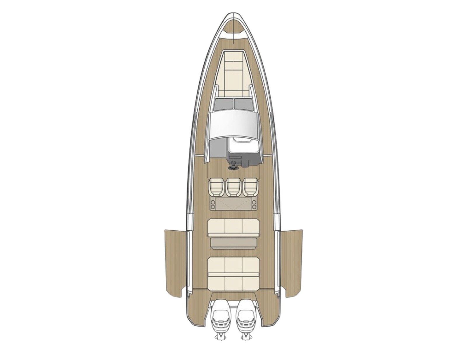 Sellerie complète, Coussins arrieres, Coussin avant, sellerie de cockpit, Rideaux occultants (in cabina e zanzariere), Supplément bain de soleil (a prua), Tauds de fermeture T-Top (trasparenti), Taud de console, 4 Taud de siège, 2 Taud de soleil (a poppa con pali in carbonio, a prua con pali in alluminio), Moustiquaires.